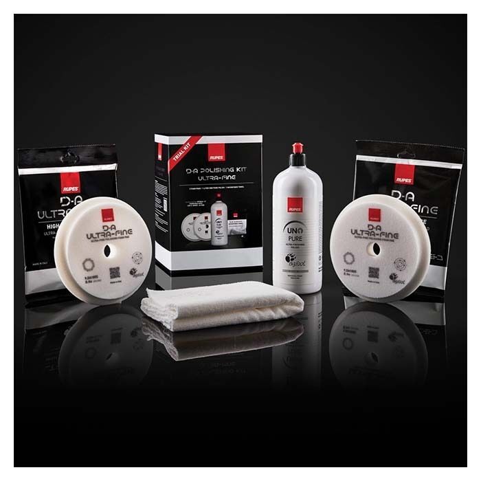 Dette trial kit med DA ULTRA-FINE er en samling af Rupes efterbehandlingsprodukter, som giver ultrafin finish, og som er designet til at producere den højest mulige optiske klarhed og refleksionsevne, når det anvendes med Rupes BigFoot poleringssystem. DA ULTRA-FINE kan anbefales uanset om målet er at opnå niveauer af showglans, eller om der arbejdes på meget sarte malingssystemer med mindre defekter.