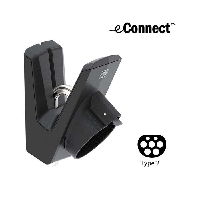 Med eConnect-dockingstation er opladningskablet til din elbil beskyttet, når du ikke bruger det. EConnect-dockingstationen er let at montere på enhver væg, så du kan opbevare ladekablet pænt og beskytte det mod tyveri og ved et uheld blive kørt over. Dockingstationen forhindrer også vand og snavs i at trænge igennem opladningsstikket.