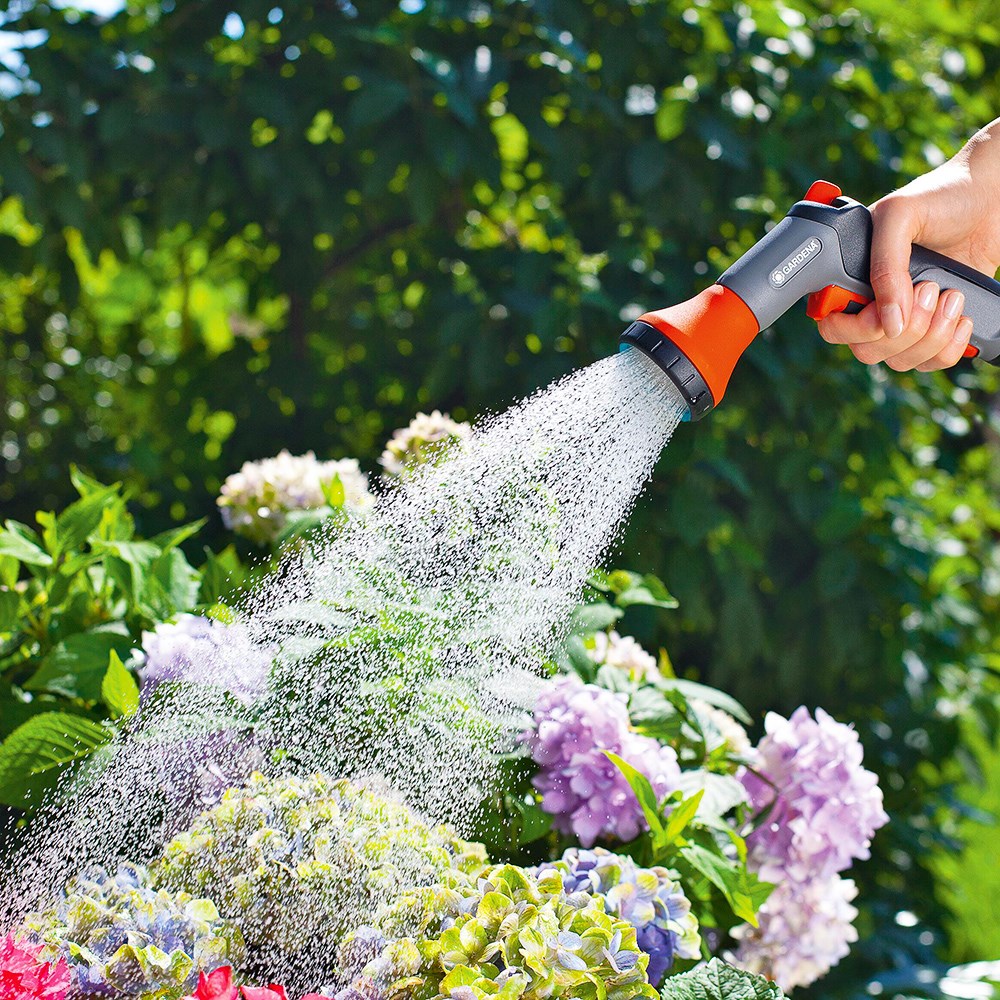 Den praktiske sprøjtepistol giver en blød sprøjtestråle og er derfor især anvendelig til krukkeplanter på terrassen eller altanen eller andre mindre områder, hvor der blot er behov for en let overbrusning af planterne og rolig vanding.
