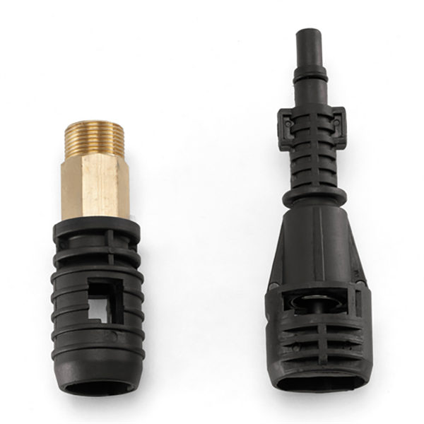 Adapterne understøtter et maksimalt vandtryk på 35 bar (3,5 MPa) og en maksimal vandtemperatur på 50°C (122°F), hvilket sikrer sikker og stabil drift under rengøringsarbejdet. Sættet indeholder en adapter med gevindskåret forbindelsesstykke og en adapter til KAERCHER-tilbehør.