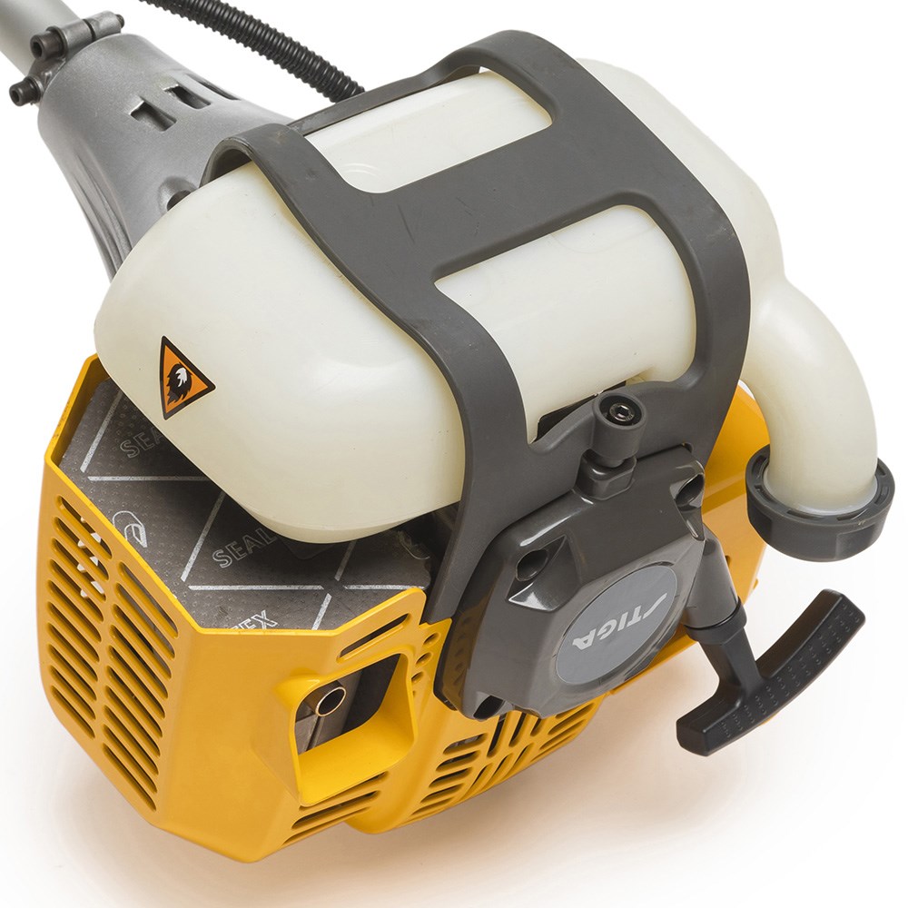 Styringen af motoren og tilkoblingen af skæreværktøjet er samlet i højre håndtag, mens der på det forstærkede rigrør er rig mulighed for at montere maskinen i den medfølgende bæresele.