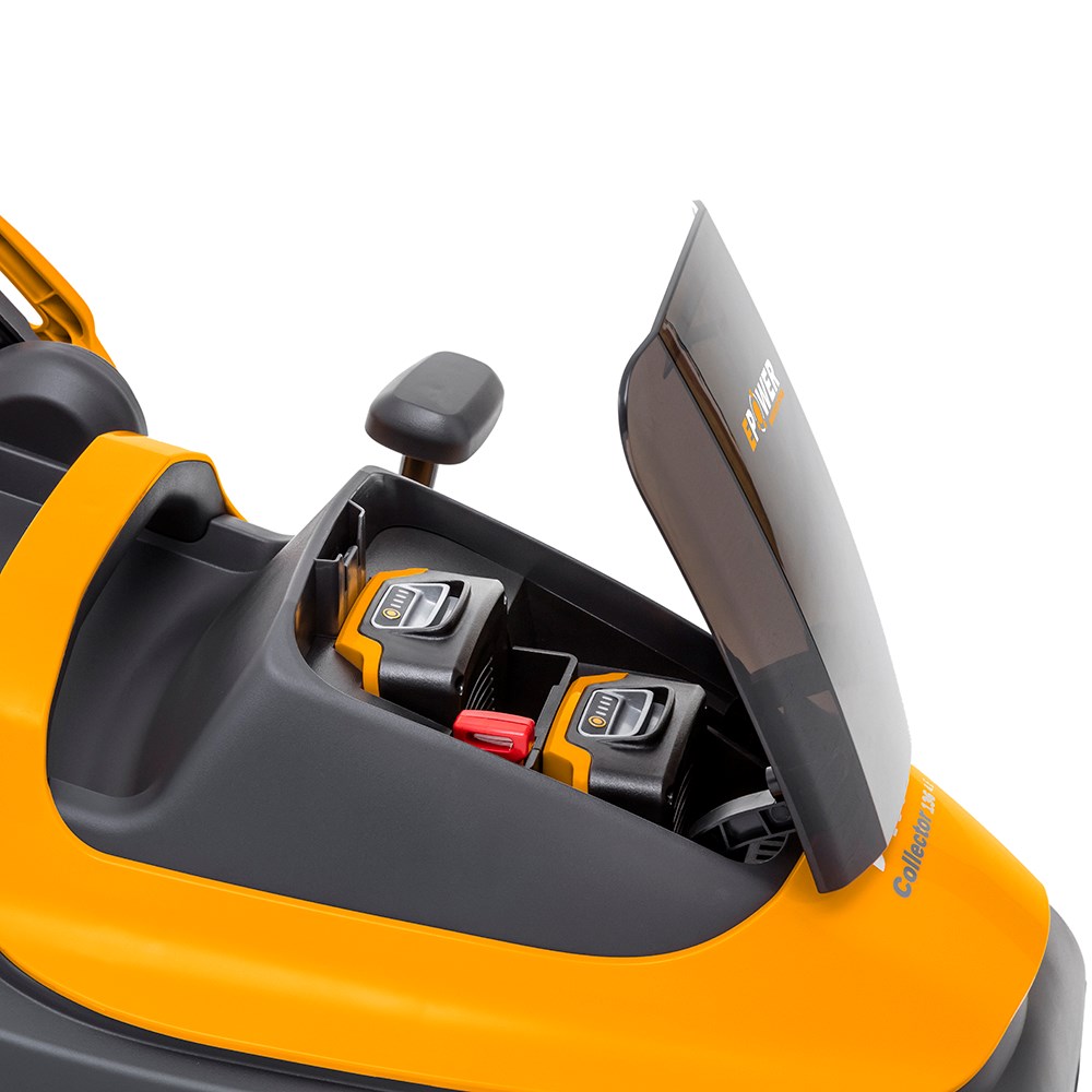 Med Collector 136e får du en ekstremt støjsvag plæneklipper, som med de to medfølgende batterier har køretid til at slå 250 kvadratmeter græs på en opladning.