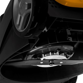 Bag det justérbare styr får du desuden komfortable softgrips, som gør maskinen mere behagelig at køre med. Styret kan justeres i højden i to trin, og derudover kan det også foldes sammen, ligesom opsamleren også kan det.