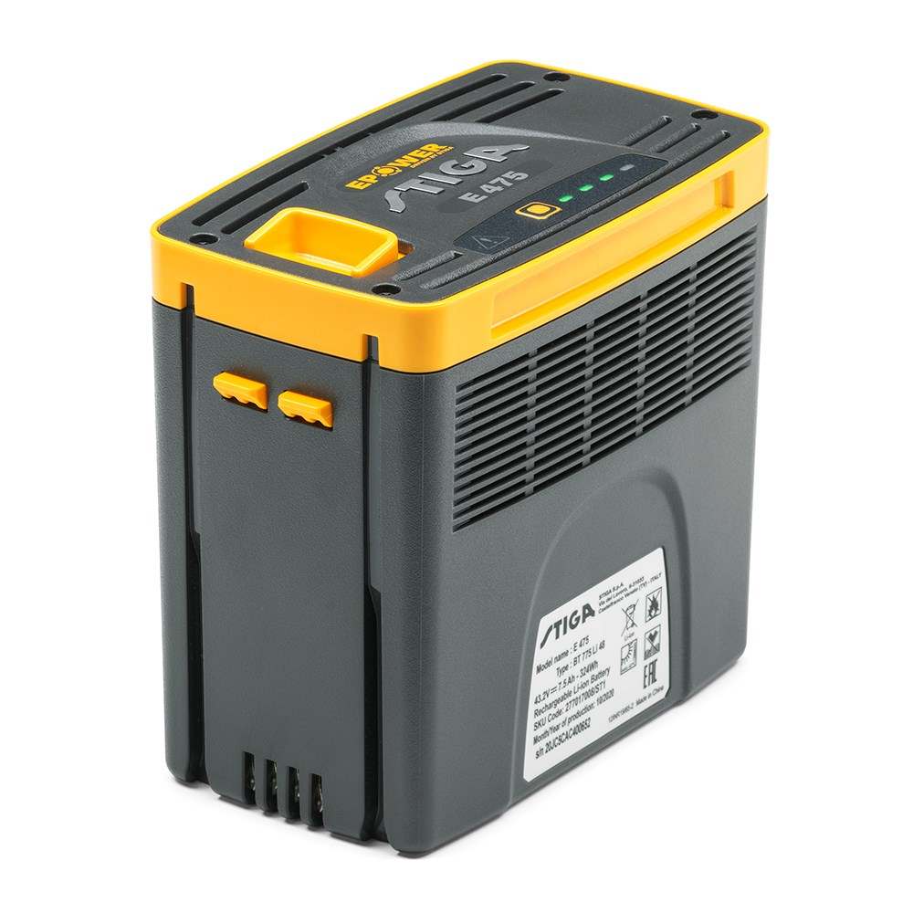 E-Power E475 fra STIGA er en stærk, universel batteri, som passer til både havemaskiner og plæneklippere.