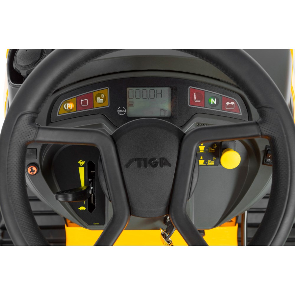 Estate 7122 W er bygget til at holde. Den kraftige støbejernsforaksel giver ekstra stabilitet og holdbarhed, selv på ujævnt terræn. Havetraktoren er udstyret med et moderne instrumentbræt med seks LED-indikatorer og et multifunktionelt display, som giver dig overblik over maskinens status og funktioner under arbejdet. Et praktisk vaskeled på klippebordet gør rengøring efter brug både hurtig og effektiv.