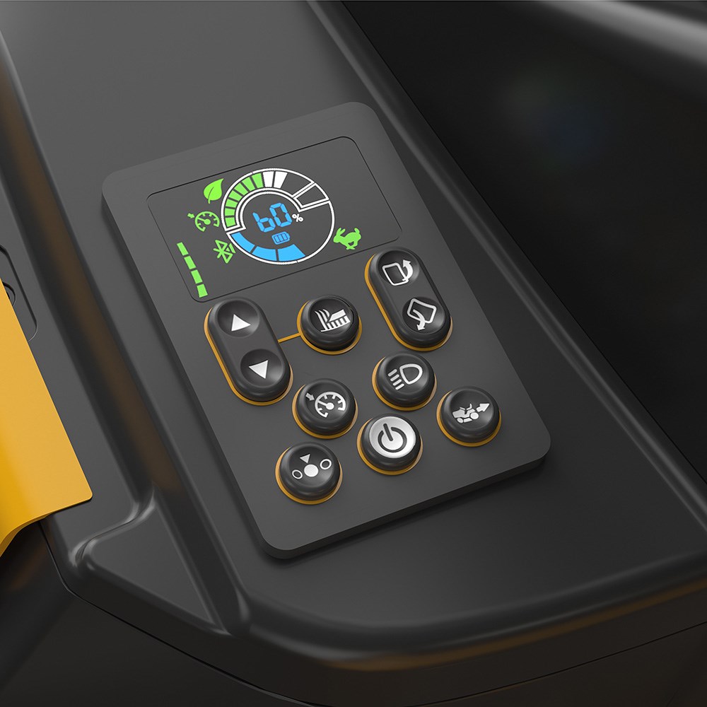 Hjertet i Estate 798e er det helt nye batteri på 64Ah og ligeledes et nyt motorsæt, som hæver effekten fra de 2.000W på e-Ride C500 og S500 til nu 3.200W. Det giver mere power og muligheden for at køre med et klippebord på hele 98 cm. Samtidigt får du ekstra features på den store, indbyggede opsamler på Estate 798e. For første gang på de elektriske modeller er der elektrisk tømning af opsamleren, og takket være den ekstra bredde på klippebordet klarer du nemt helt op til 7.000 m2.