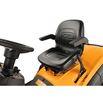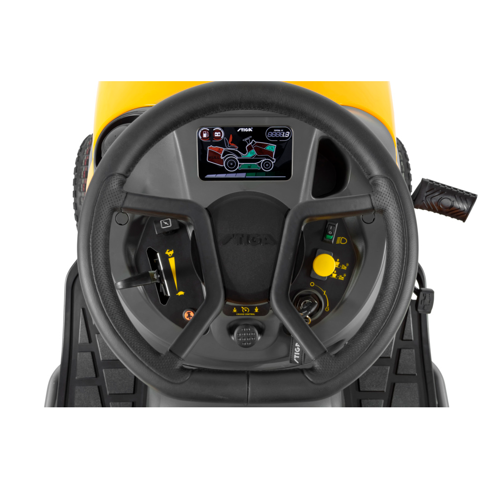 Havetraktoren er udstyret med et ergonomisk førersæde med armlæn og et forhøjet rat, som giver en behagelig arbejdsstilling under længere klipninger. Det smarte 5,5” widescreen-display gør det let at følge vigtige driftsparametre. Den hydrostatiske transmission styres via fodpedal og giver en glidende, trinløs hastighedskontrol uden gearskift. Med elektromagnetisk knivtilkobling er det nemt at aktivere klipningen med ét tryk.