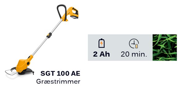 Med GT 100e får du en samlet pakke og er derfor godt begyndt. Her er batteri og lader inkluderet, og batteriet - E-Power E22 - passer også i en række andre havemaskiner i Stigas Essential-serie.