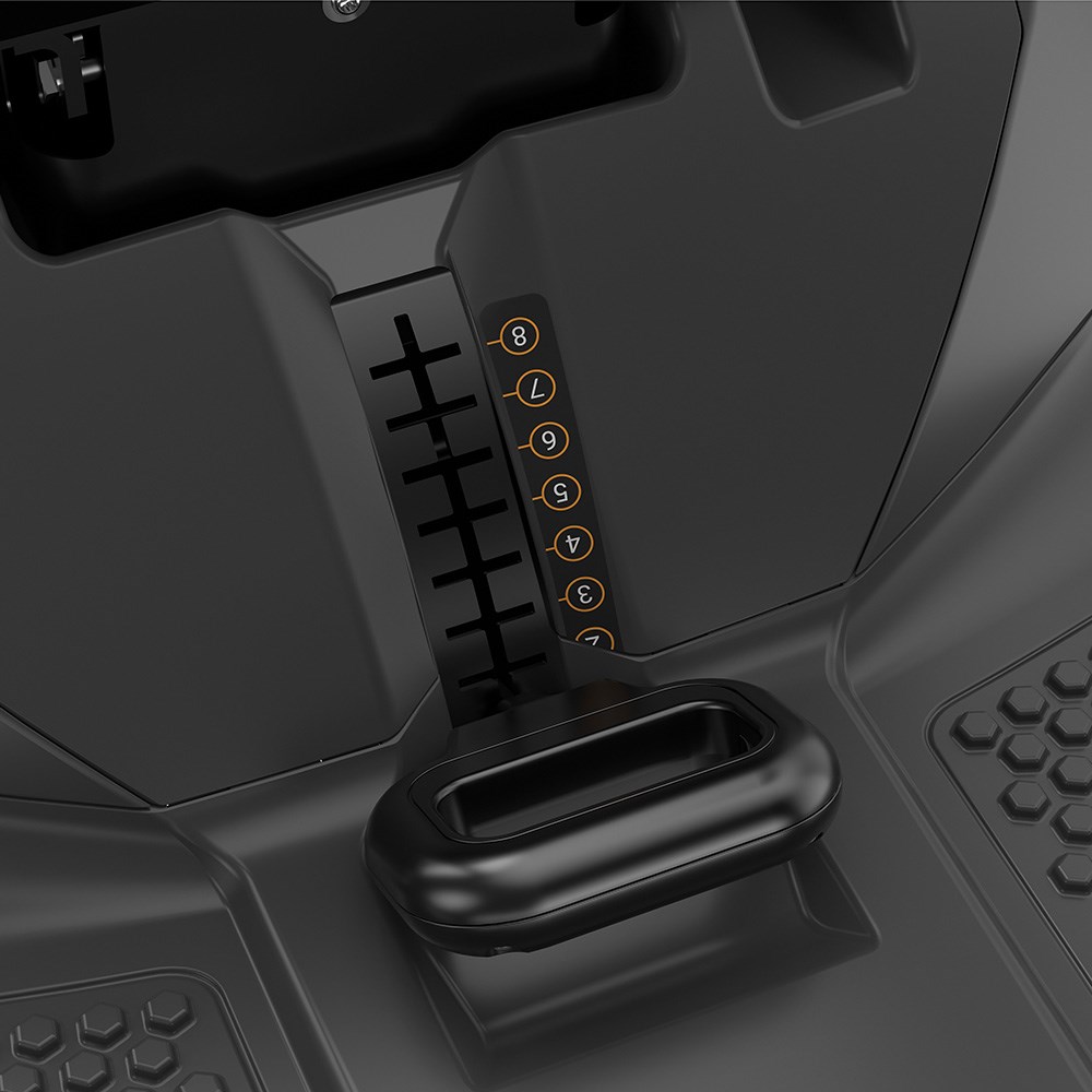 Samtidigt er maskinen fri for pedaler, så du kan placere dine ben som du lyster. I højre armlæn sidder det smarte kontroldisplay, som giver dig alle funktioner og informationer lige ved joysticket. Kun nøglen til at starte og stoppe sidder ikke her, så alt er samlet i ét.