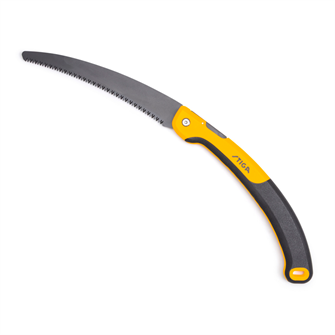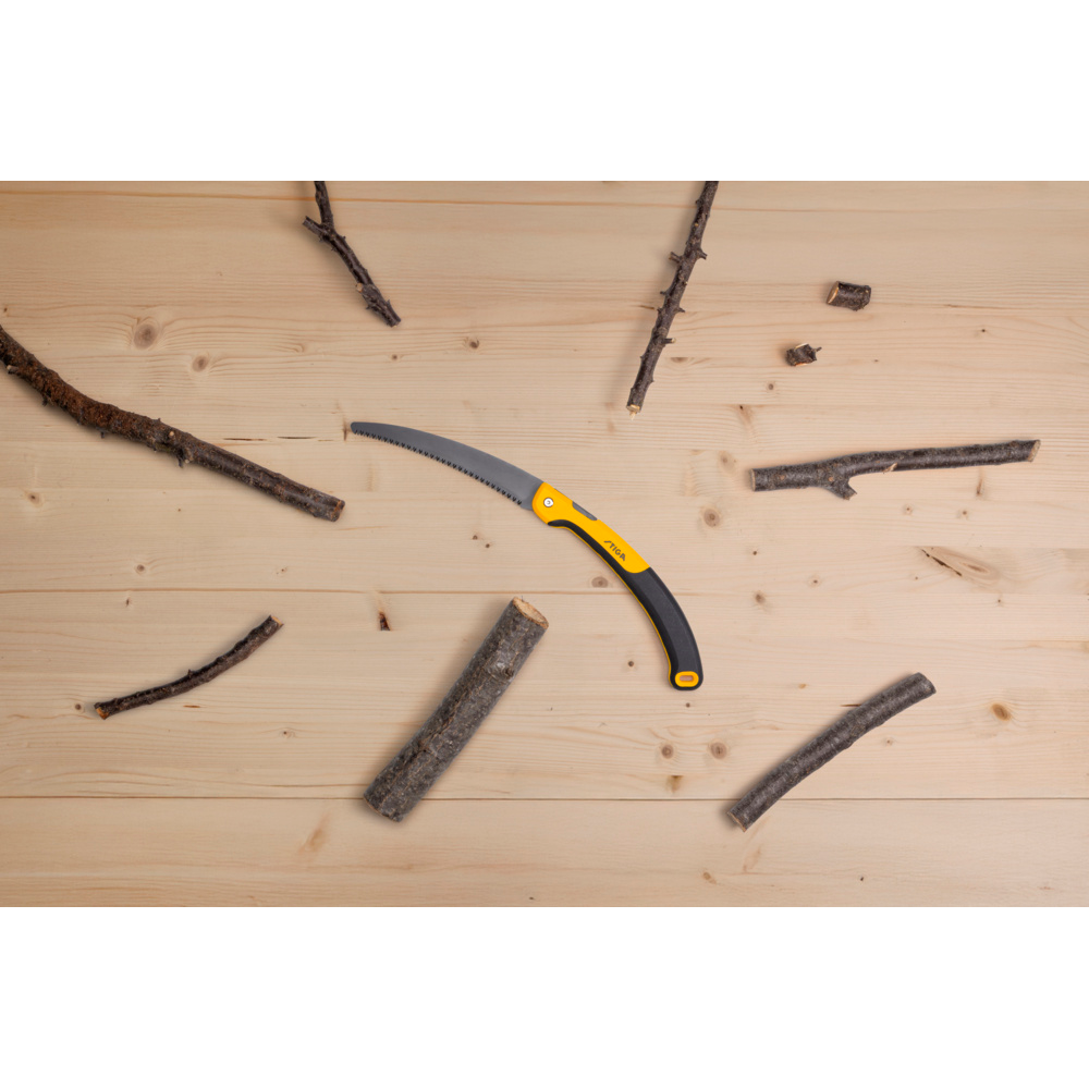 Det ergonomiske håndtag med ekstra greb giver bedre kontrol og mindsker træthed under brug, selv ved længerevarende arbejde. Den lysegule finish gør saven let at få øje på i græsset eller tæt vegetation, hvilket reducerer risikoen for at miste den under arbejdet.