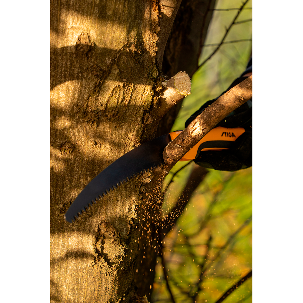 STIGA Folding Beskæringssav er designet til nem og effektiv beskæring af tørt og dødt træ med en diameter på op til 150 mm. Den buede klinge med tredobbelt slebne tænder giver præcise og jævne snit, mens non-stick-belægningen reducerer friktion og letter rengøringen, så saven forbliver effektiv i lang tid.