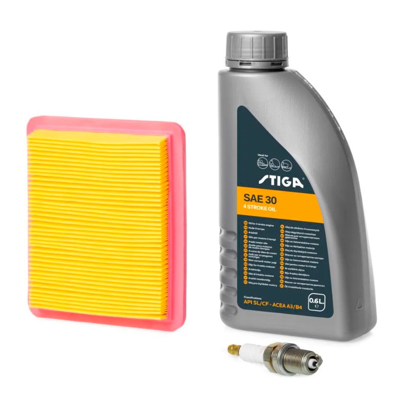 Sættet indeholder alt nødvendigt til standardvedligeholdelse: 0,6 liter 4-takts olie, tændrør og luftfilter, som hjælper med at forlænge motorens levetid og bevare optimal funktion.