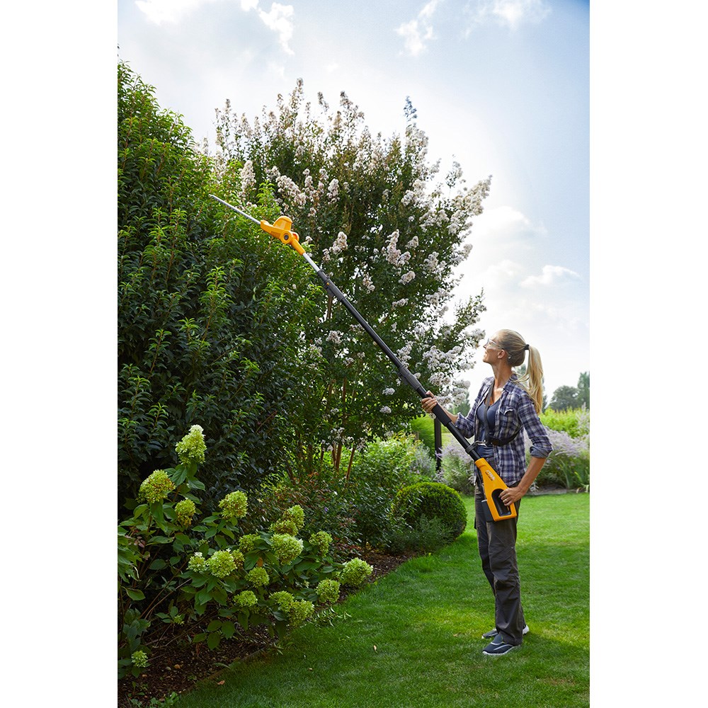 Stanghækkeklipperen har et 45 cm langt sværd, lavet af hærdet stål og en tandafstand på 18 mm, som kan klare langt de fleste opgaver. Det er muligt at vippe klippehovedet op til 112 grader, for en mere praktisk stilling.