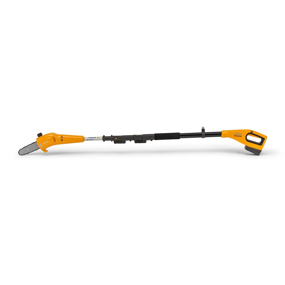 Indbygget i maskinen er en 55 cm lang teleskopstang, som kan trækkes ud i den længde du ønsker. Totalt kan MT 100e med hækkeklipper nå en maksimal længde på 275 cm, mens den er 255 cm med saven monteret.