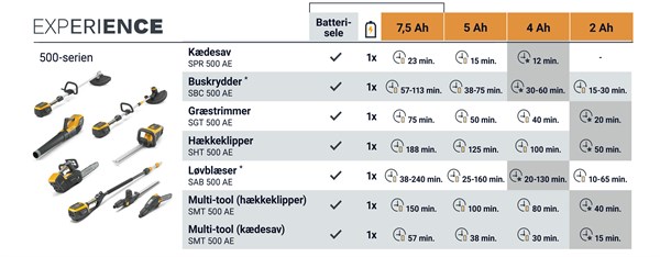 STIGA anbefaler her, at man bruger batteriet på 4.000 mAh, E440. Et E440 rækker til cirka 12 minutters arbejde.