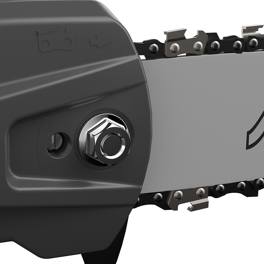 Det 10" lange sværd har sidemonteret kædestrammer. Når du arbejder med PS 900e er der også en automatisk beskyttelsesmekanisme i saven, som går ind, hvis saven overbelastes eller overophedes, og derfor kan du trygt køre på.