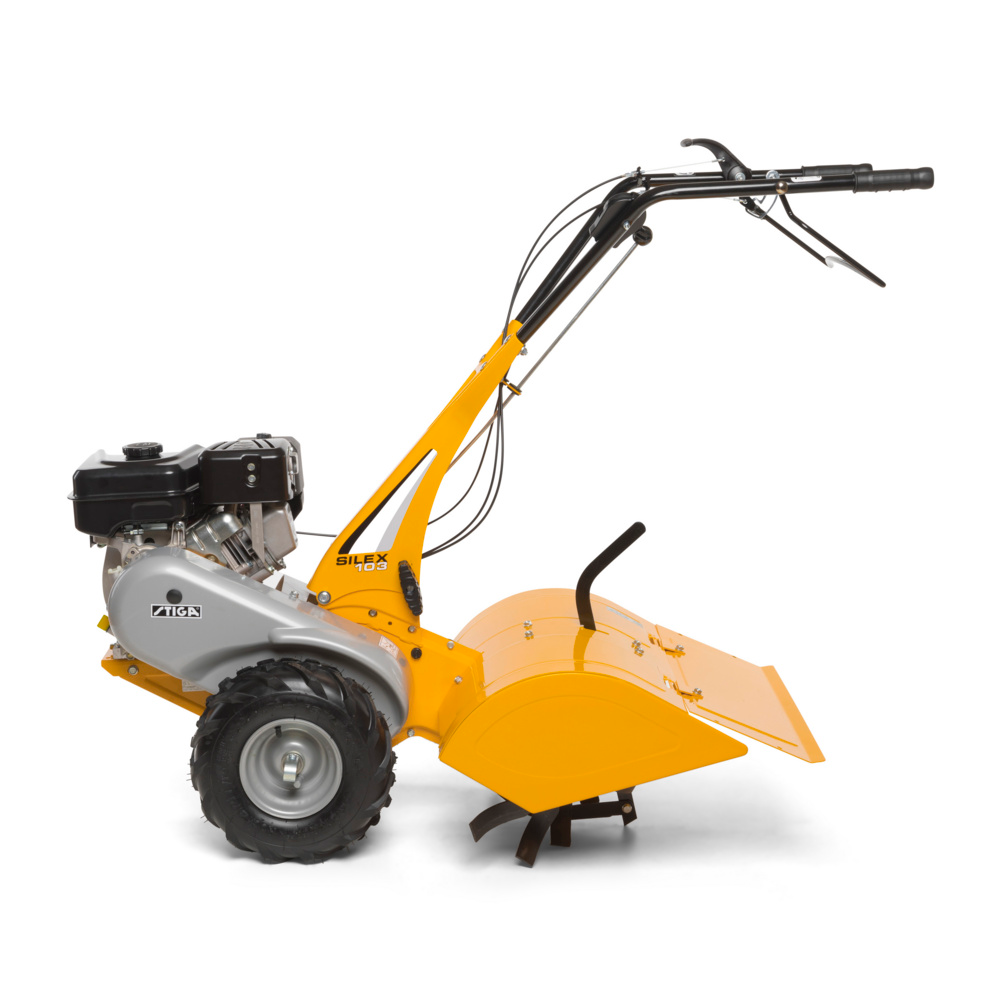 Jordfræseren har to hjul, som gør det let at flytte maskinen mellem arbejdsområder. Kombinationen af kraft, metalrotorer og solid konstruktion gør Silex 103 B pålidelig og velegnet til både små køkkenhaver og større intensivt bearbejdet jord.