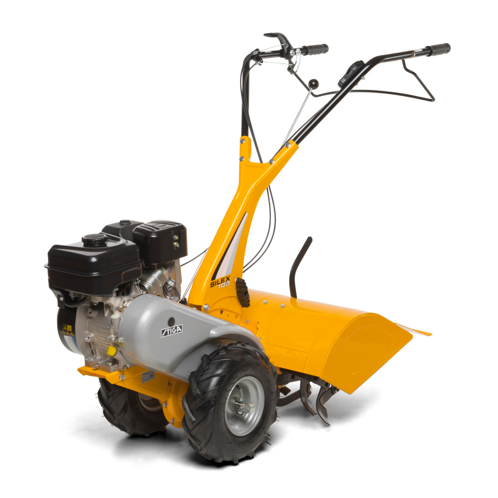 STIGA Silex 103 B er udstyret med en kraftfuld 208 cm³ 4-takts Briggs & Stratton-benzinmotor, der klarer selv krævende jordbearbejdning. De seks bagudvendte metalrotorer giver en arbejdsbredde på 60 cm og en dybde på 22 cm, hvilket sikrer effektiv opløsning af jordklumper og forbedret jordstruktur til såning og plantning.