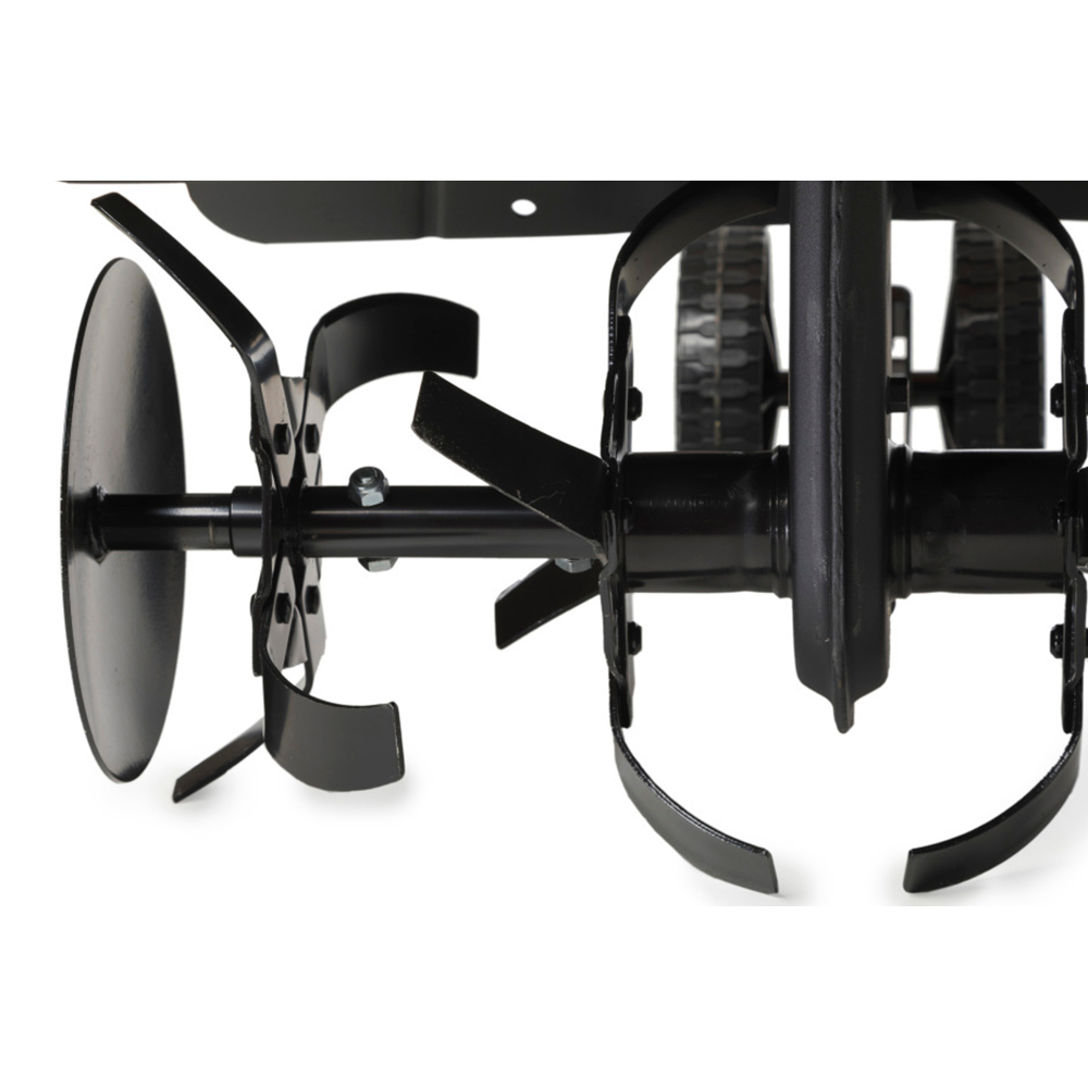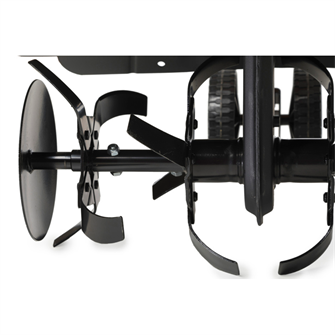 Jordfræserens håndtag kan justeres i både højde og vinkel, hvilket sikrer komfort under arbejdet. To gear – 1 fremad og 1 bak – giver god manøvredygtighed, mens sidebeskyttelsesskiver gør det muligt at arbejde tæt på træer og kanter uden risiko for skader.