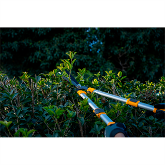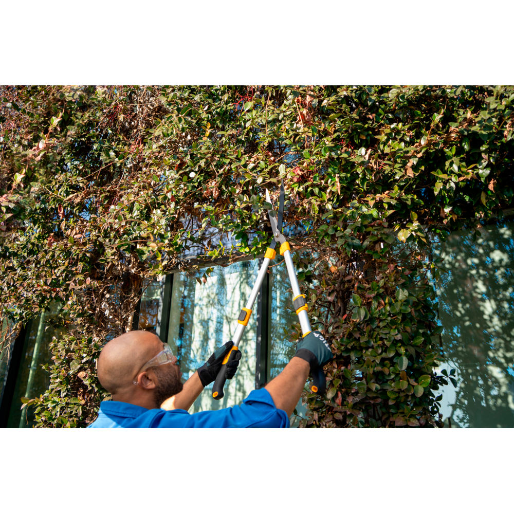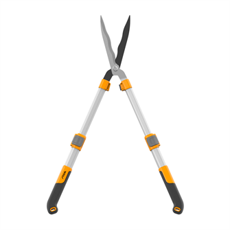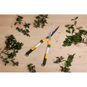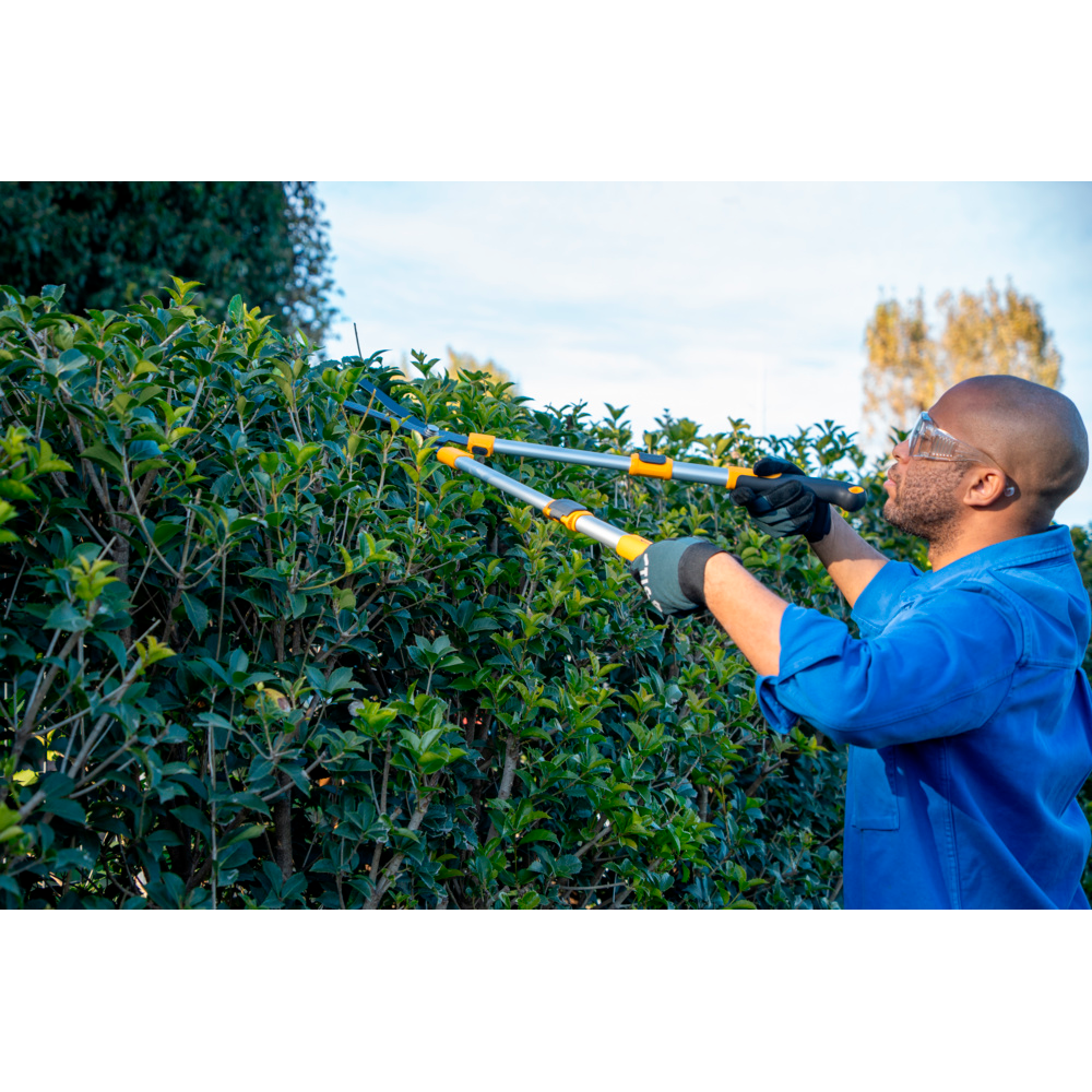 STIGAs teleskopiske hækkesaks gør det muligt at klippe hække på op til 2,5 meters højde med minimal indsats. Den robuste, non-stick teflonbelagte klinge giver rene og præcise græsafklip, hvilket sikrer en flot finish på både høje og levende hække.