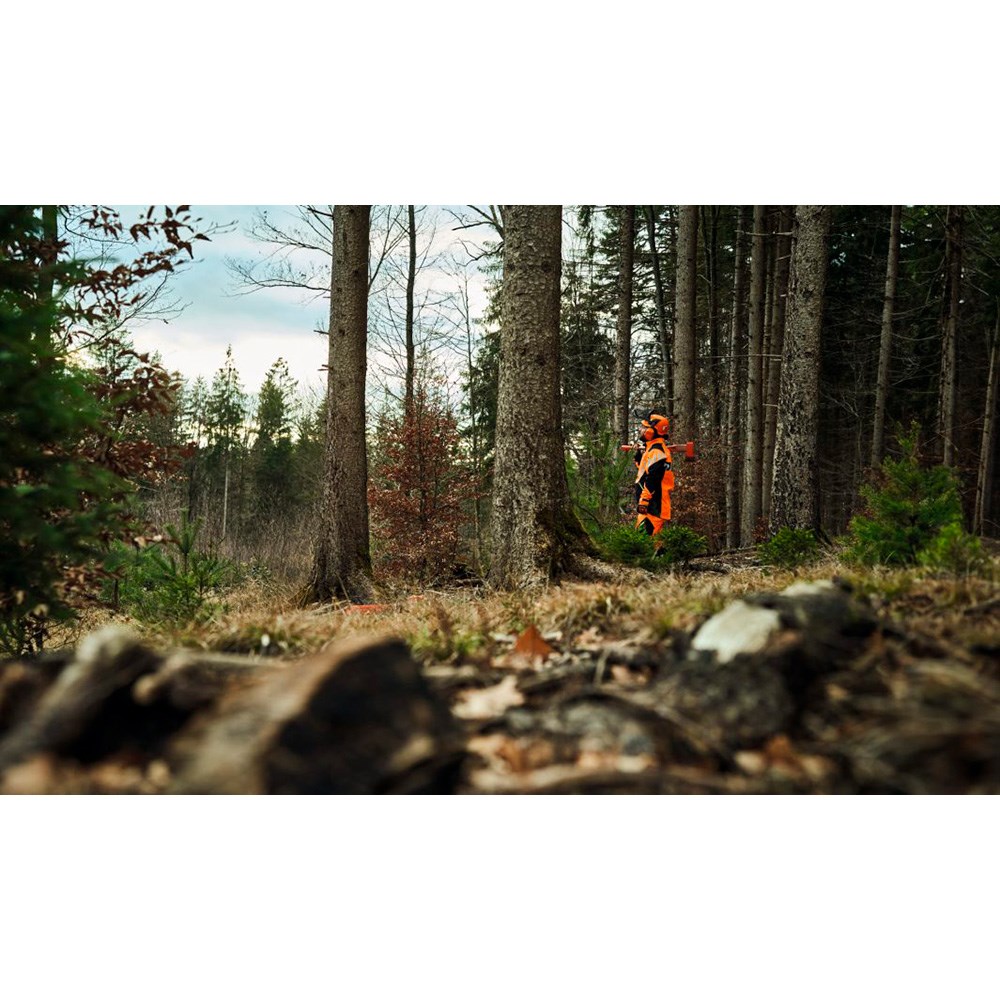 Høj synlighed er afgørende for sikkerhed, især i dårlige lysforhold. Den store andel fluorescerende orange og refleksstriber gør dig synlig på lang afstand, hvilket reducerer risikoen for arbejdsulykker. Jakken er desuden forstærket med elastisk, vandtæt beskyttelse ved albuerne, der både modstår slid og beskytter mod torne og skarpe grene.