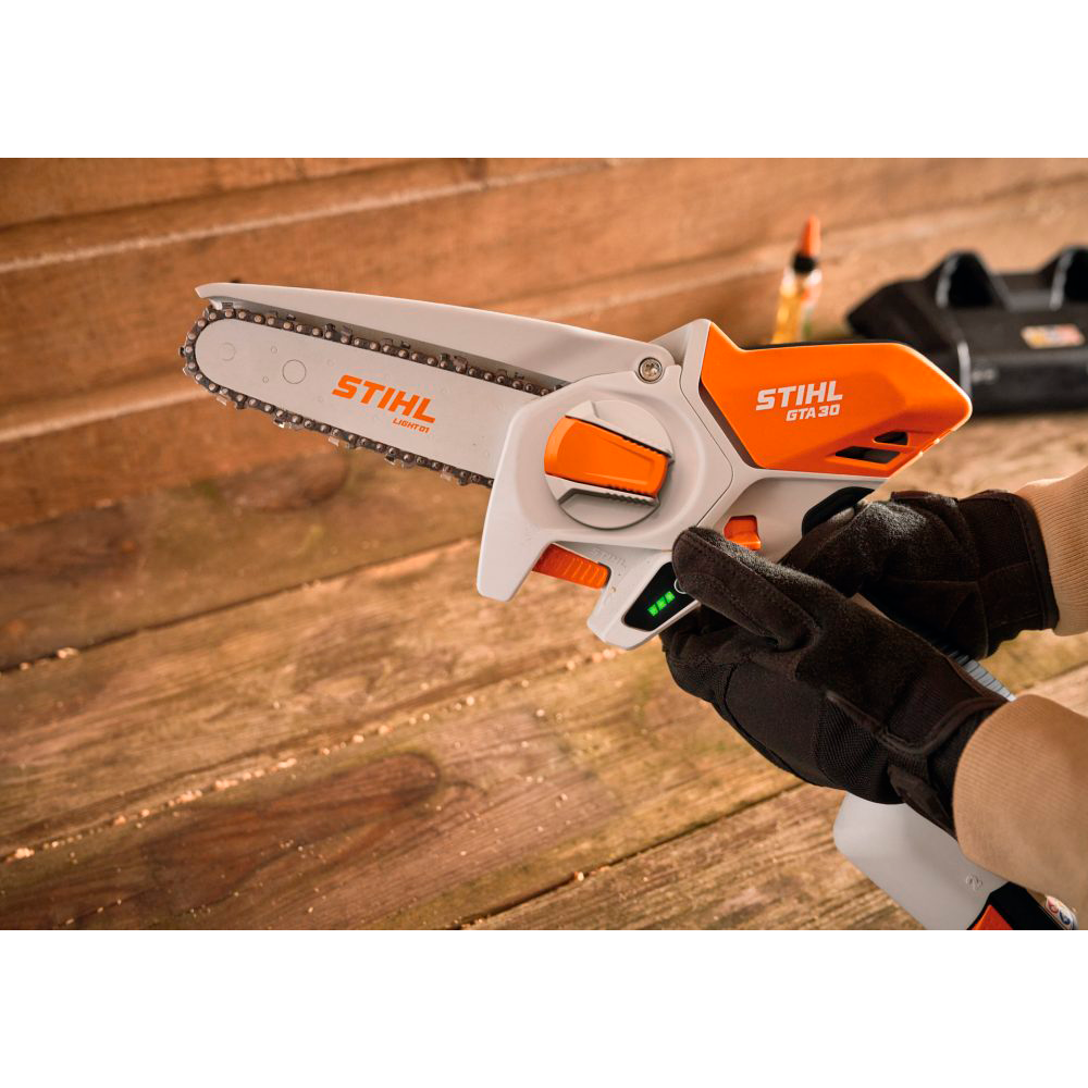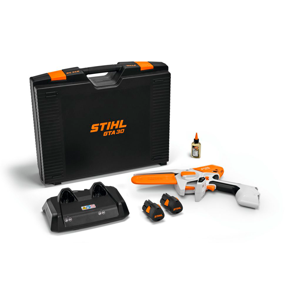 STIHL GTA 30 leveres som et praktisk sæt med 2 STIHL AS 2 lithium-ion-batterier og en AL 5-2 dobbeltoplader, så du kan gå direkte i gang med arbejdet. Sættet inkluderer desuden en robust værktøjskasse og STIHL Multioil Bio multifunktionsolie, hvilket gør det nemt at starte træpleje, brændesavning og havearbejde uden ekstra tilbehør.