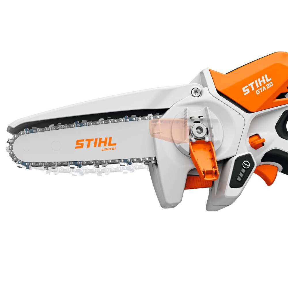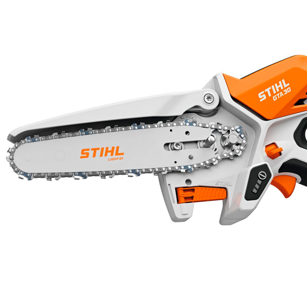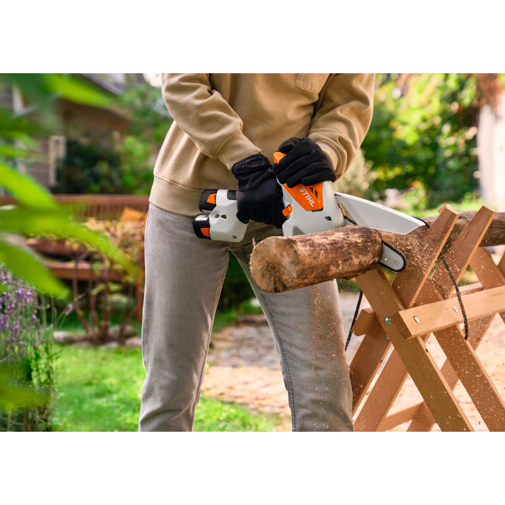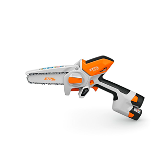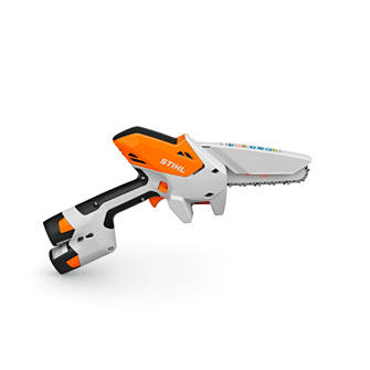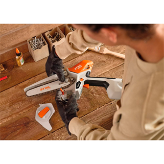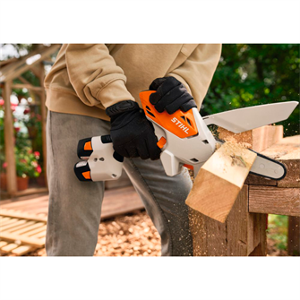 Med den kraftige EC-motor og STIHL 1/4" PM3-savkæde kan grene med en diameter på op til 15 cm skæres præcist og komfortabelt. Den orange udfoldelige spændearm og den værktøjsfri kædespænding gør det hurtigt og enkelt at justere kæden, selv med handsker på. Det integrerede tandhjul reducerer friktion og sikrer effektiv skæring, mens de gummierede håndtag giver sikker og fleksibel betjening for både højre- og venstrehåndede brugere.