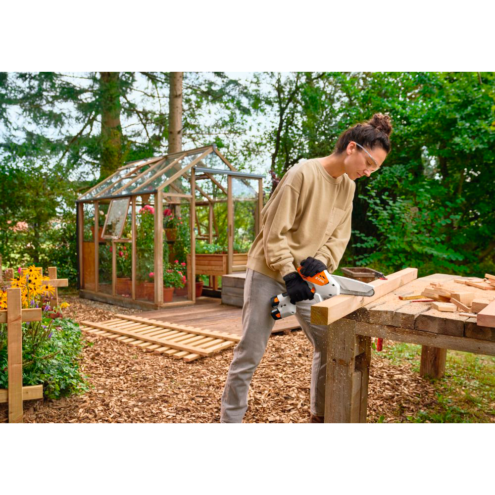 Det slanke, lette design og ergonomiske håndtag gør arbejdet behageligt, selv over længere perioder. Den svingbare beskyttelseskappe beskytter mod den skarpe kæde under arbejdet. LED-displayet viser batteriniveauet, og den praktiske bærebøjle gør det nemt at opbevare saven på væggen, når den ikke er i brug.