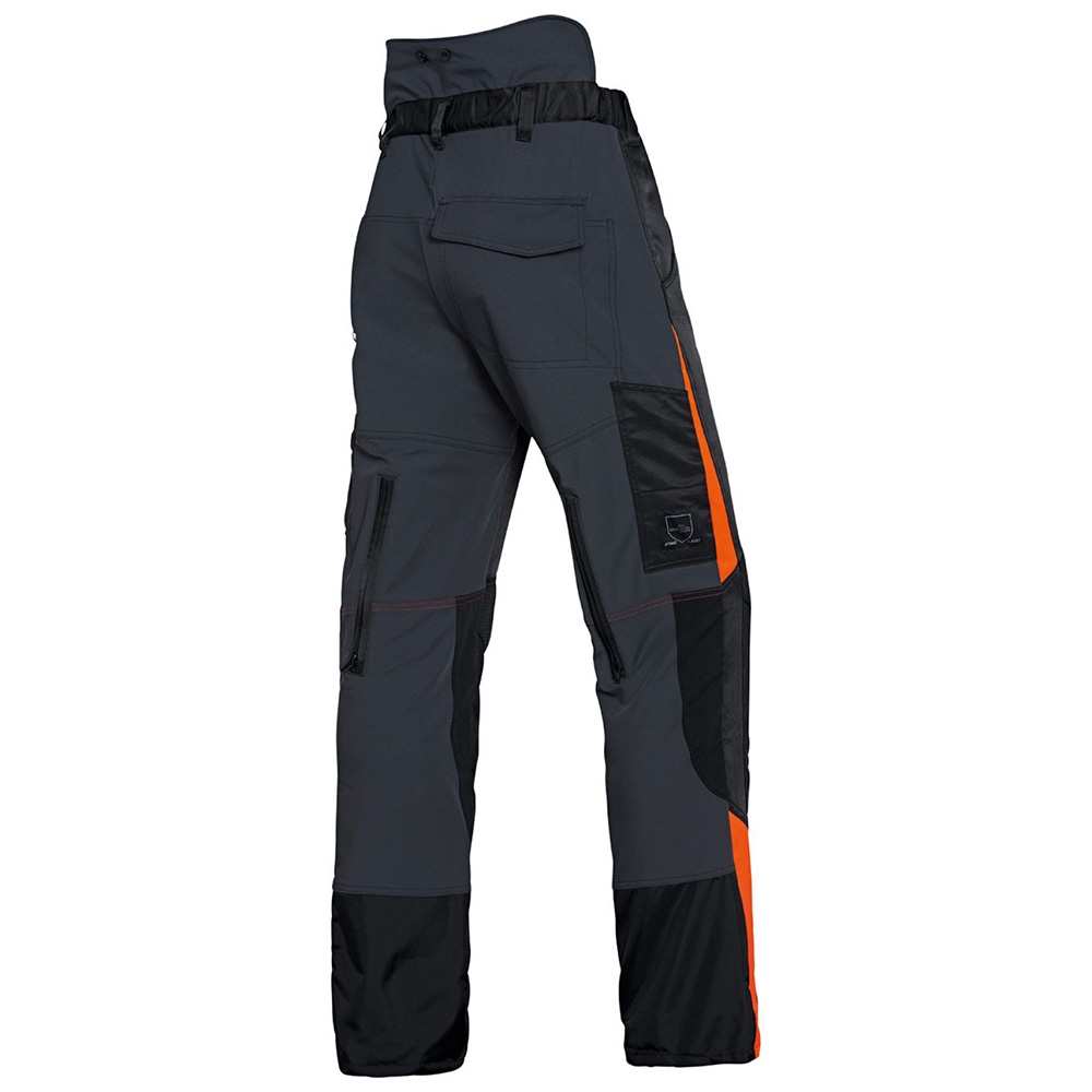 Generelt er forstærkningerne på sikkerhedsbukserne fremstillet af vandtæt, torneafvisende og åndbart materiale. I forhold til standardmaterialer har sikkerhedsstoffet i bukserne her op til 75% bedre ventilation og ca. 21% lavere varmeisolering, så beskyttelsesbukserne er meget lette, og alligevel kan du både ånde i dem og holde varmen.