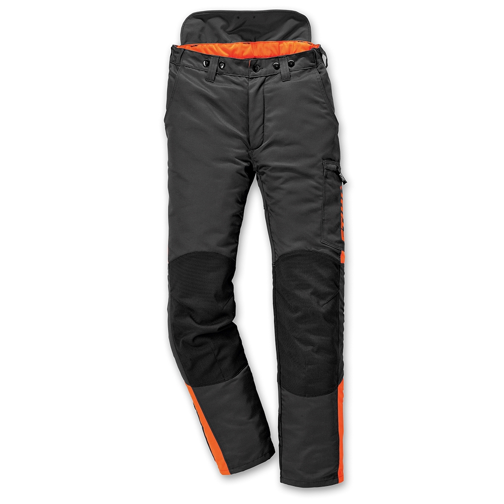 Alle STIHLs sikkerhedsbukser er fremstillet med et skæreindlæg i flere lag, hvis fibertråde vil vikle sig om savkæden, hvis saven skulle trænge igennem yderstoffet, og blokere kædedrevet. Dermed stopper motoren omgående, og du undgår skade.