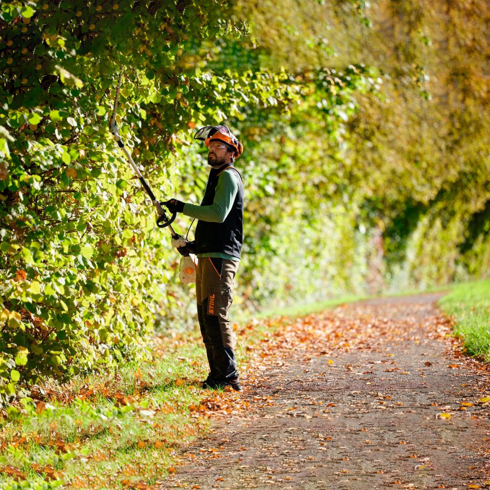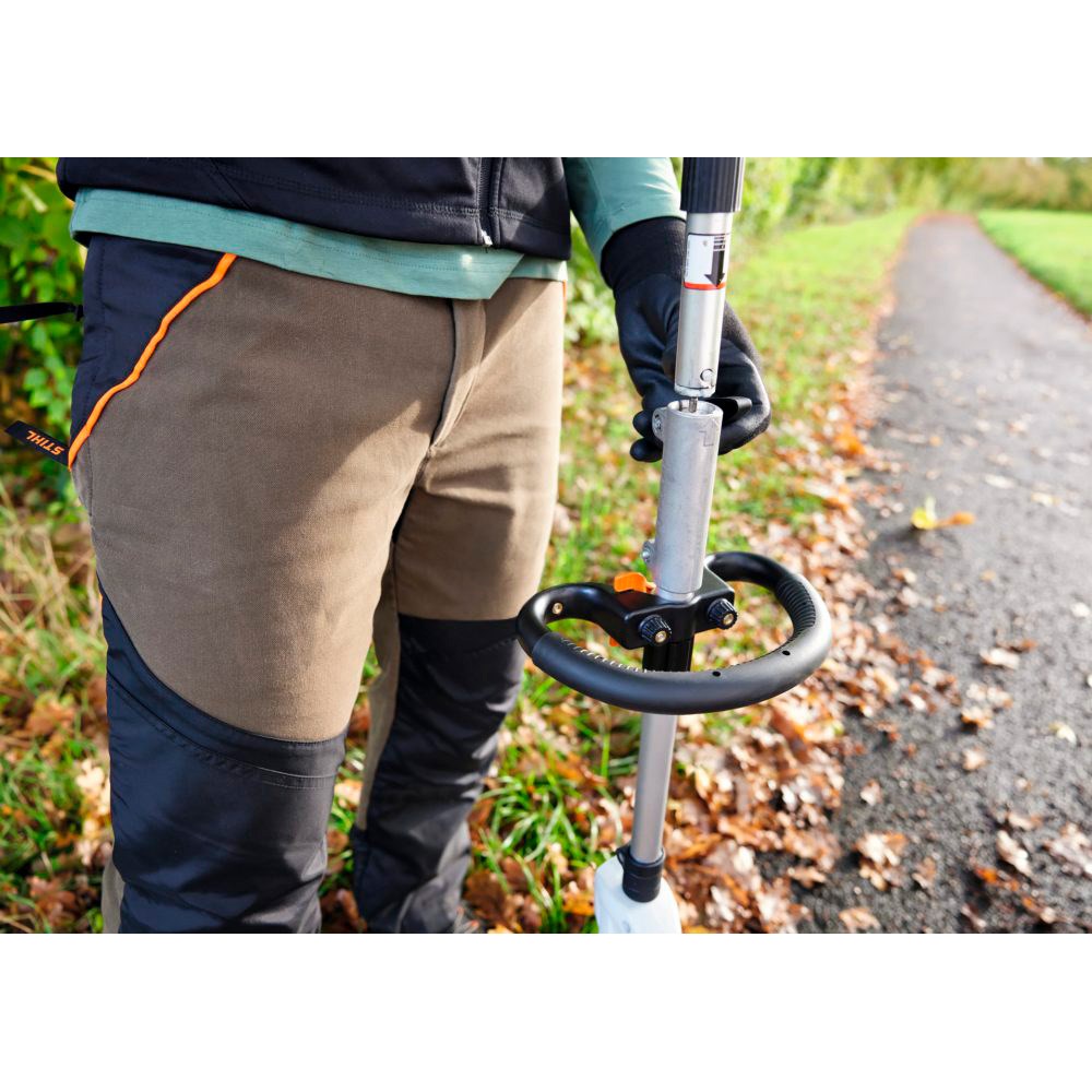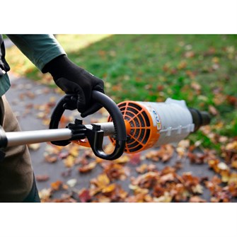 Med det ergonomiske loophåndtag får du fuld kontrol over maskinen, selv i trange arbejdssituationer. For ekstra sikkerhed beskytter en skridtbegrænser dig mod kontakt med skæreknivene eller trimmehovederne. Maskinen er også designet til nem og hurtig til- og frakobling af kombiværktøjer via en lynkobling, og dens delbare skaft gør transport og opbevaring let og pladsbesparende.