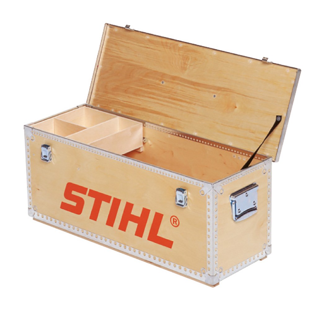 Opbevar din motorsav med STIHL - i denne gedigne kasse af solid finértræ med metalforstærkninger på kanterne samt solide lukketøjer og håndtag.