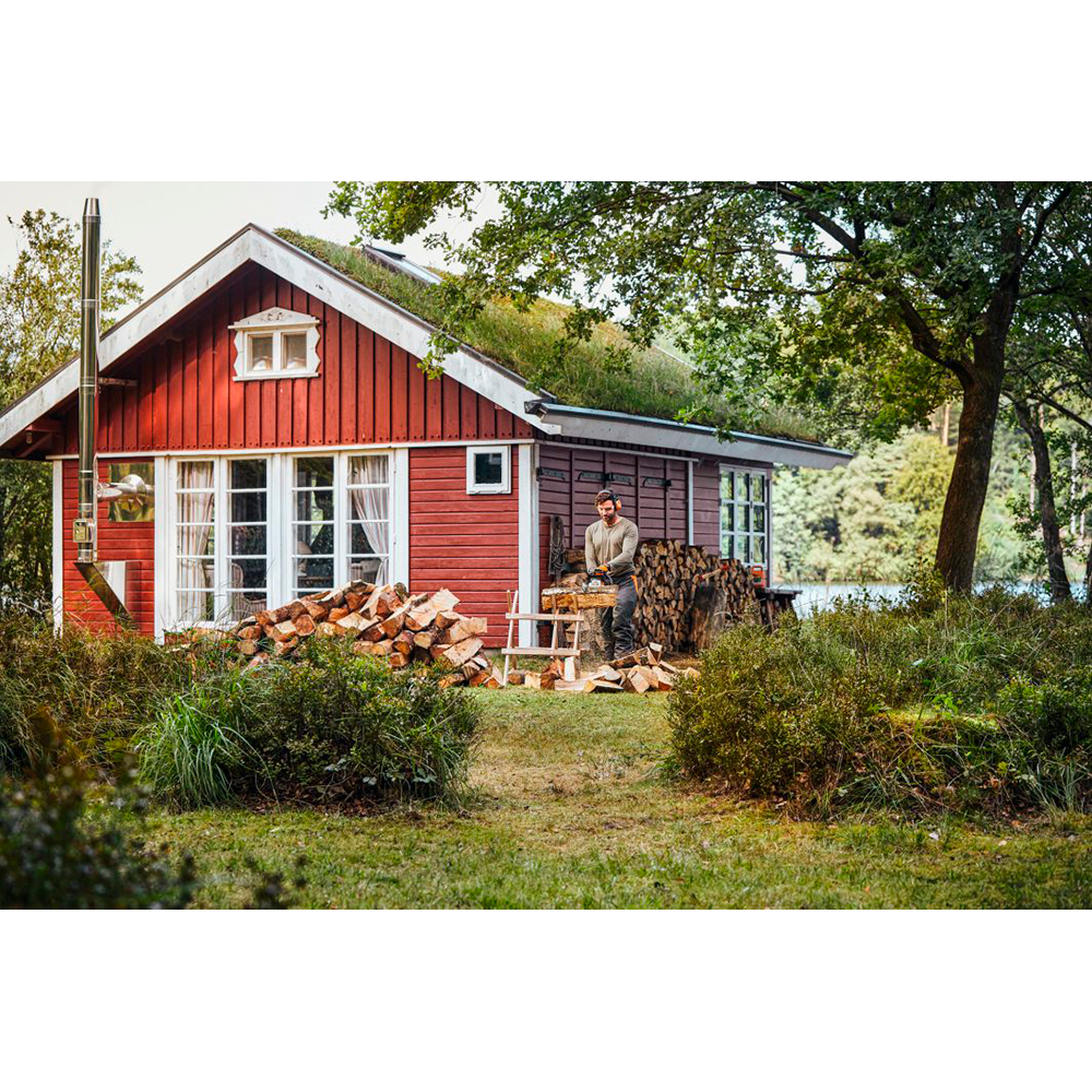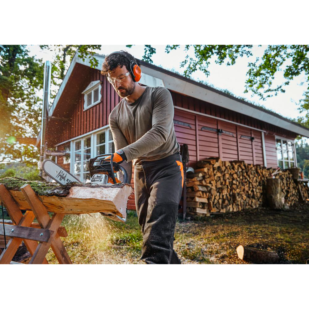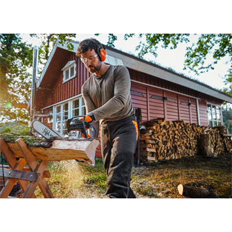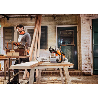 Med kædestramning i siden kan du hurtigt og bekvemt justere kæden, og étgrebsbetjeningen gør det muligt at styre alle funktioner – start, drift og stop – med én hånd. Kombihåndtaget med stopfunktion gør genstart efter korte pauser ekstra nemt, da saven hurtigt er klar igen.