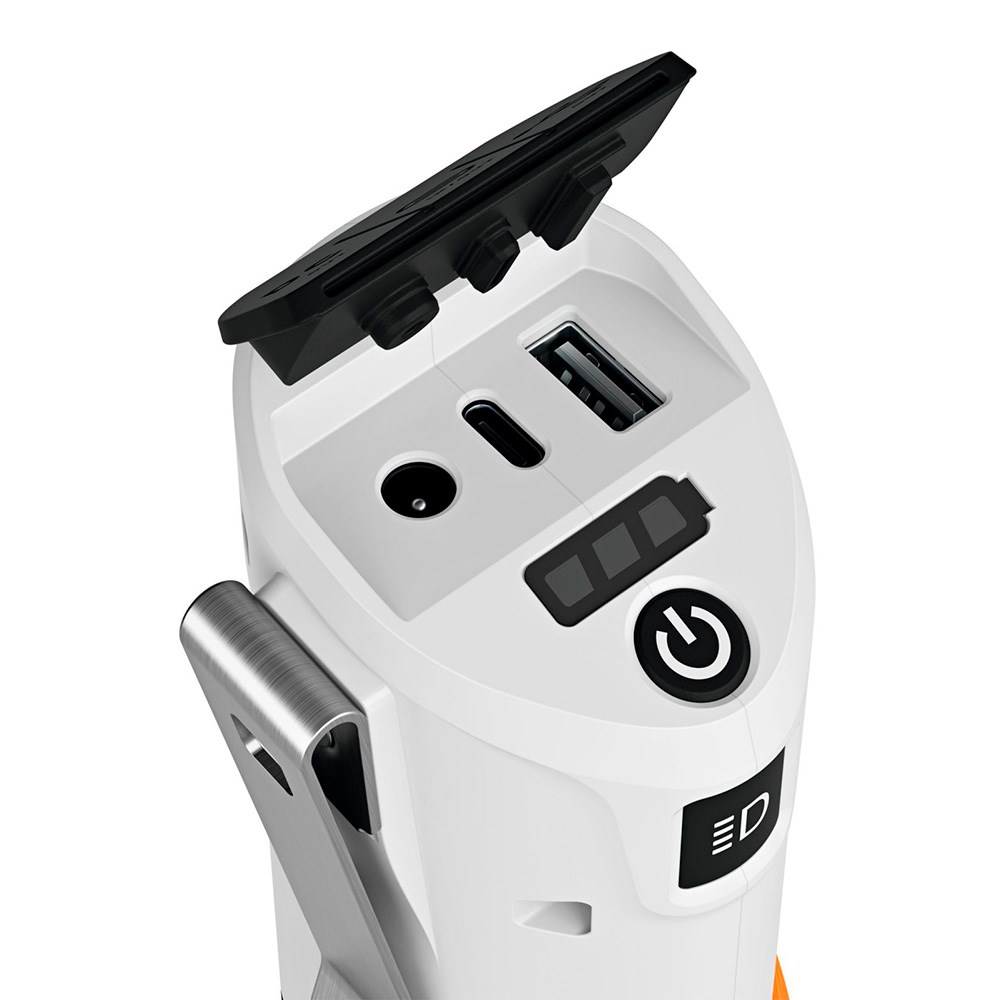 Den integrerede LED-lommelygte har to lysstyrkeniveauer og lyser med op til 100 lumen. Det sikrer godt udsyn i mørke omgivelser og er ideelt til opgaver i mindre, svært tilgængelige områder – både i naturen og i hjemmet.