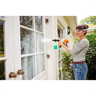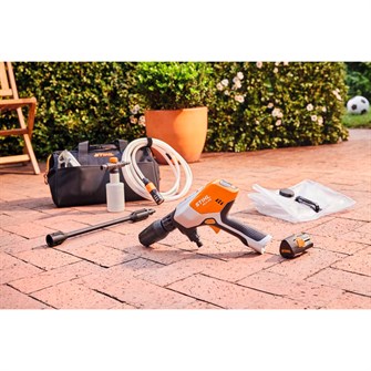 Alt nødvendigt tilbehør – fra sprøjtesæt til forlænger og opbevaringstaske – medfølger. Perfekt til rengøring af havemøbler, cykler, grill og mere.