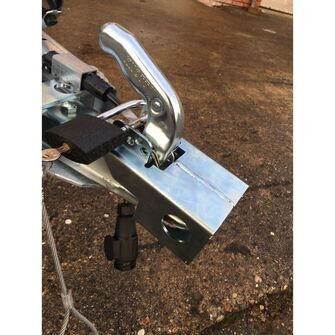 Kassen fastgøres på kuglekoblingen, hvorefter hængelåsen monteres således, at kasse-delen ikke kan trækkes af.