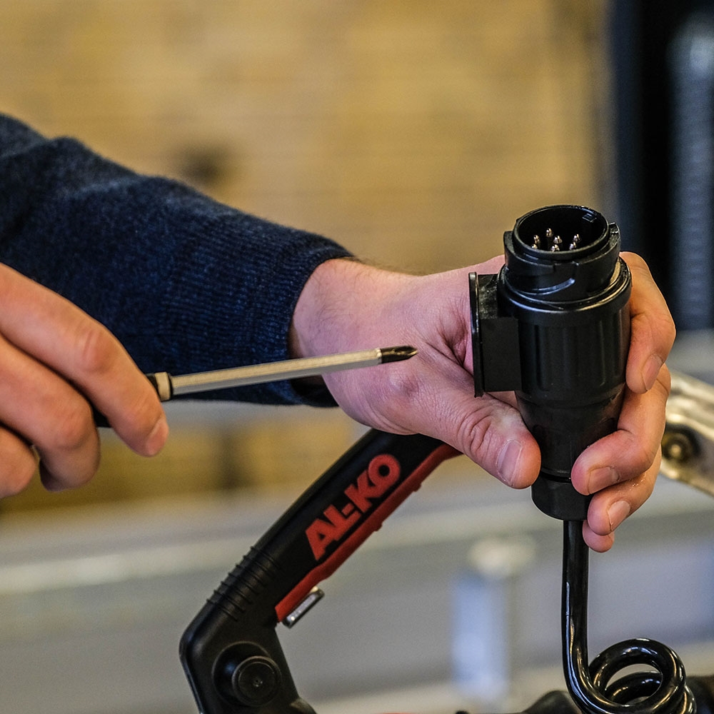 Vi skifter nemt dit strømstik på din trailer til et nyt 13-polet stik. Prof-Shoppens egne montører skifter stikket til nyt og tester, at alle lygter lyser og fungerer, som de skal.