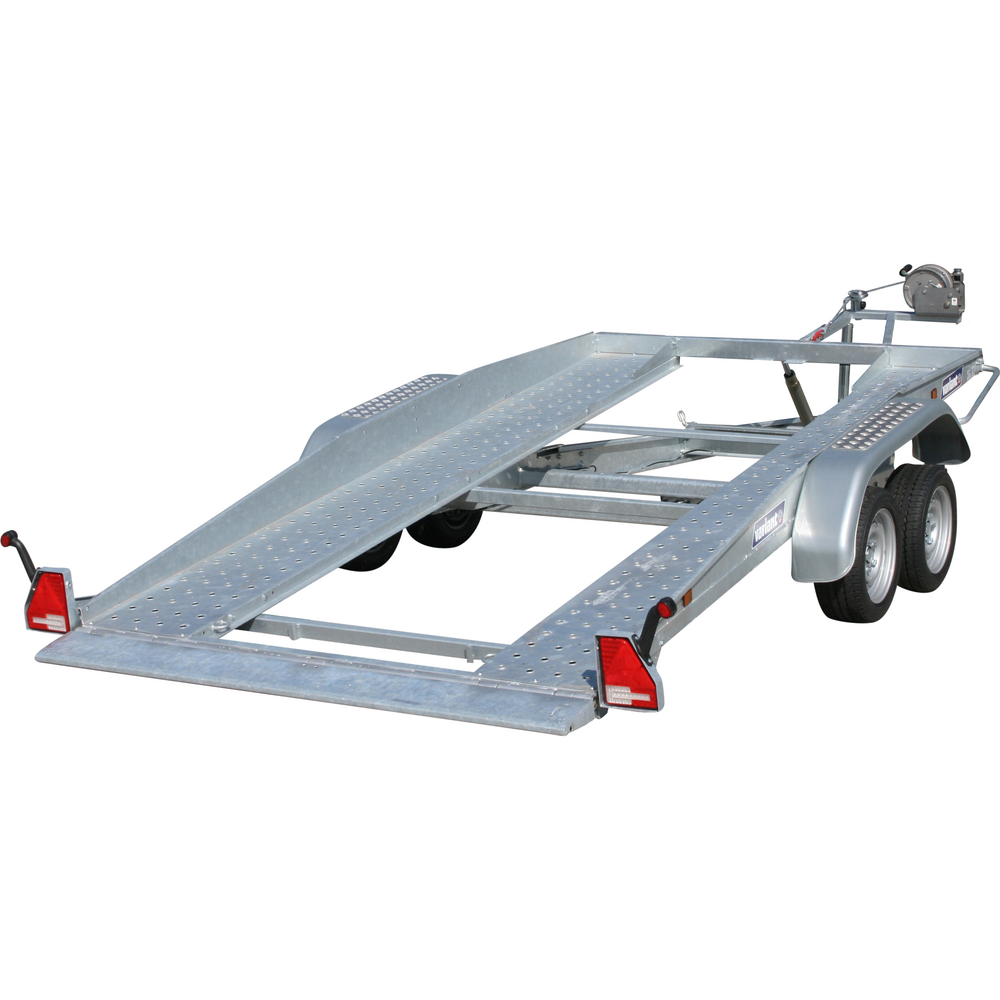 Et manuelt ophalerspil gør det nemt at trække biler eller maskiner op på ladet, og næsehjul medfølger for lettere manøvrering, selv når traileren ikke er tilkoblet køretøjet.