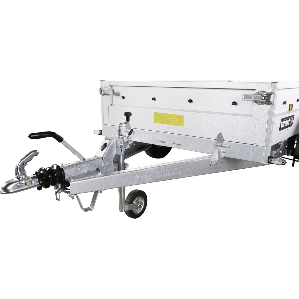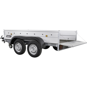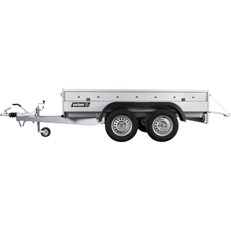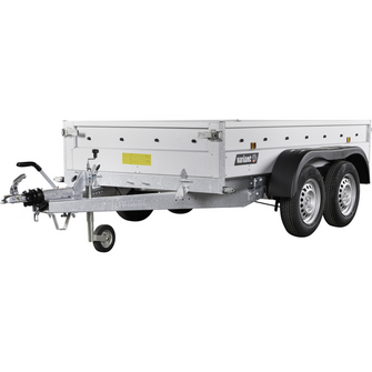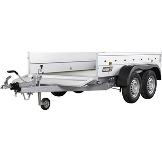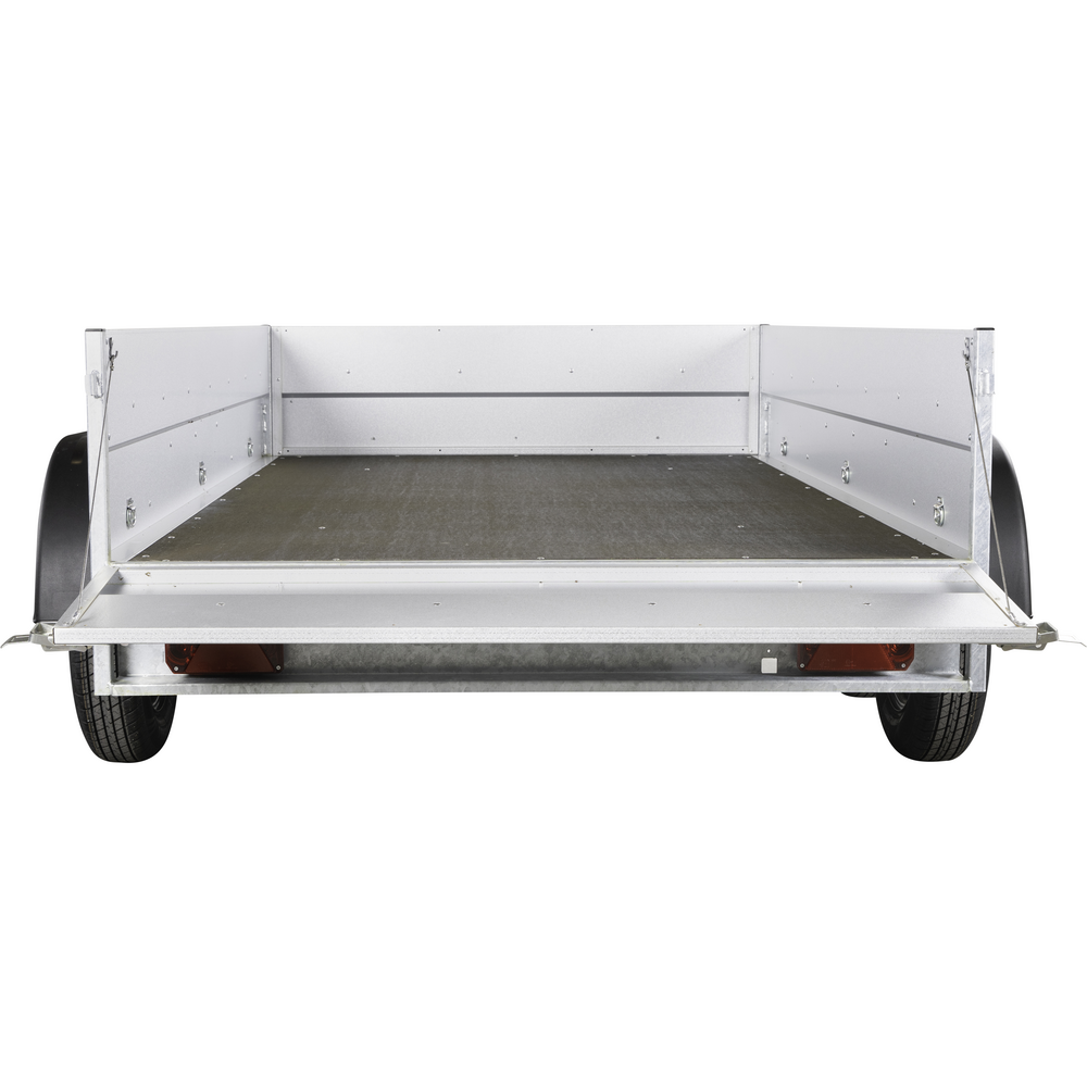 Traileren har to aksler, og hjulene er placeret på siden af chassiset for optimal stabilitet, selv ved tung last. Den solide finerbund giver en holdbar og slidstærk overflade, som kan tåle daglig intensiv brug. Fire udvendige surringsøjer sikrer, at lasten kan fastgøres sikkert under transport.