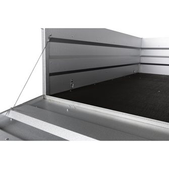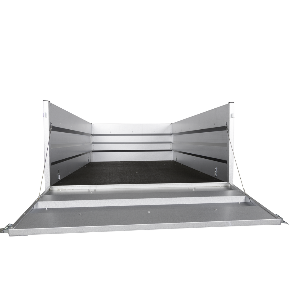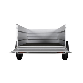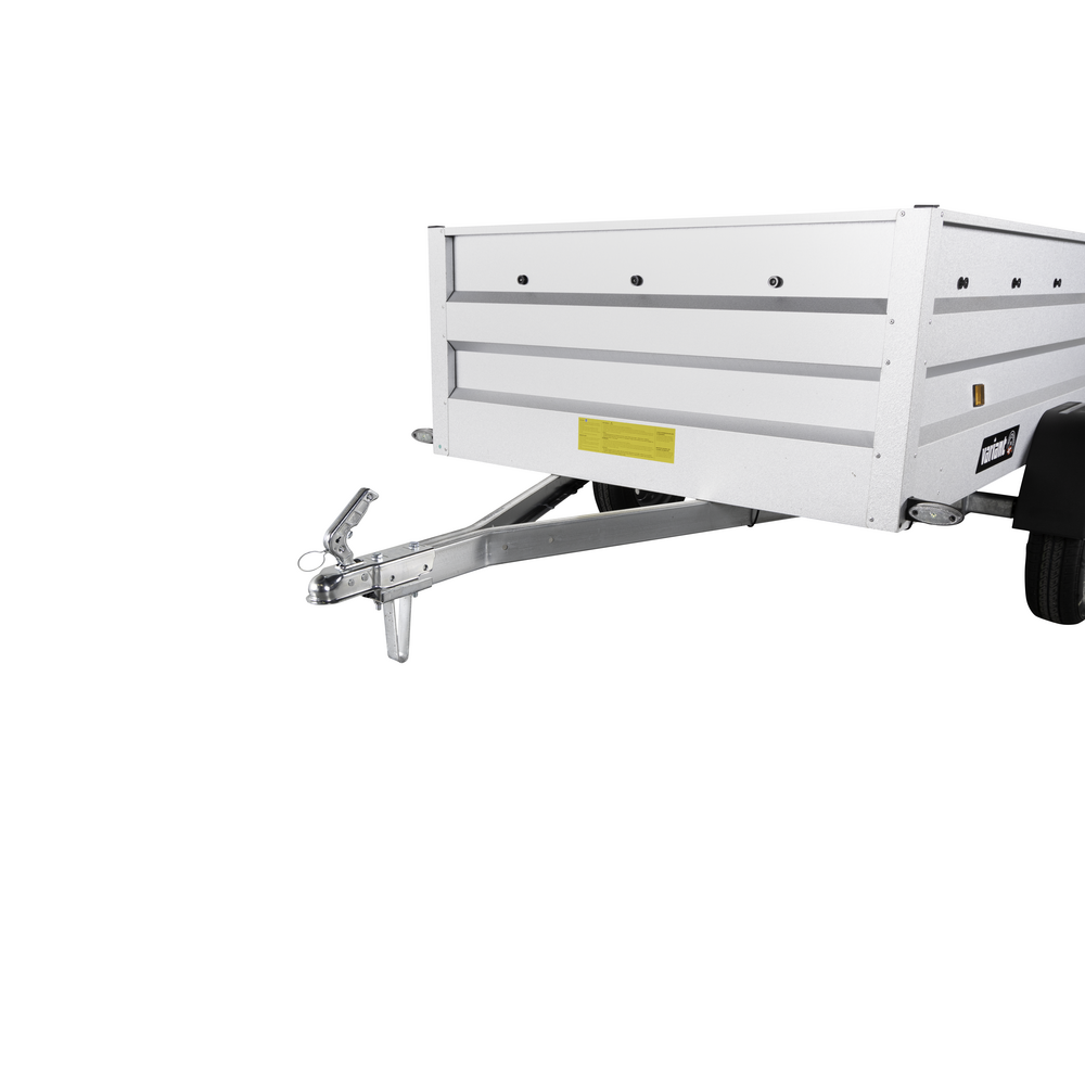 Hjulene er placeret på siden af chassiset, hvilket øger stabiliteten under kørsel, især når traileren er fuldt lastet. De fire udvendige surringskroge gør det nemt at sikre lasten, uanset om det drejer sig om tunge materialer eller løst affald.