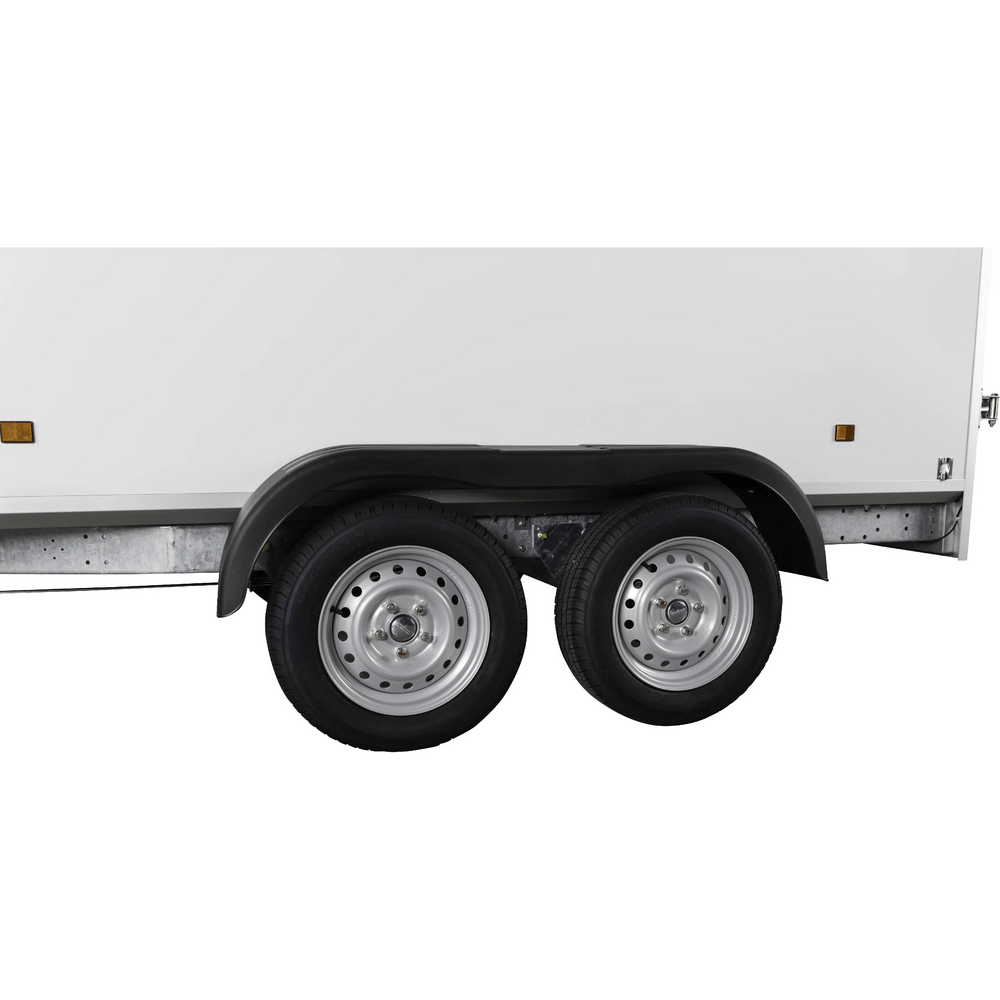 Traileren er udstyret med dobbelte aksler og hjul placeret på siden af chassiset, hvilket giver øget stabilitet – selv ved tung last. Med bremser og et medfølgende næsehjul er traileren nem at manøvrere og sikker både under kørsel og ved parkering.