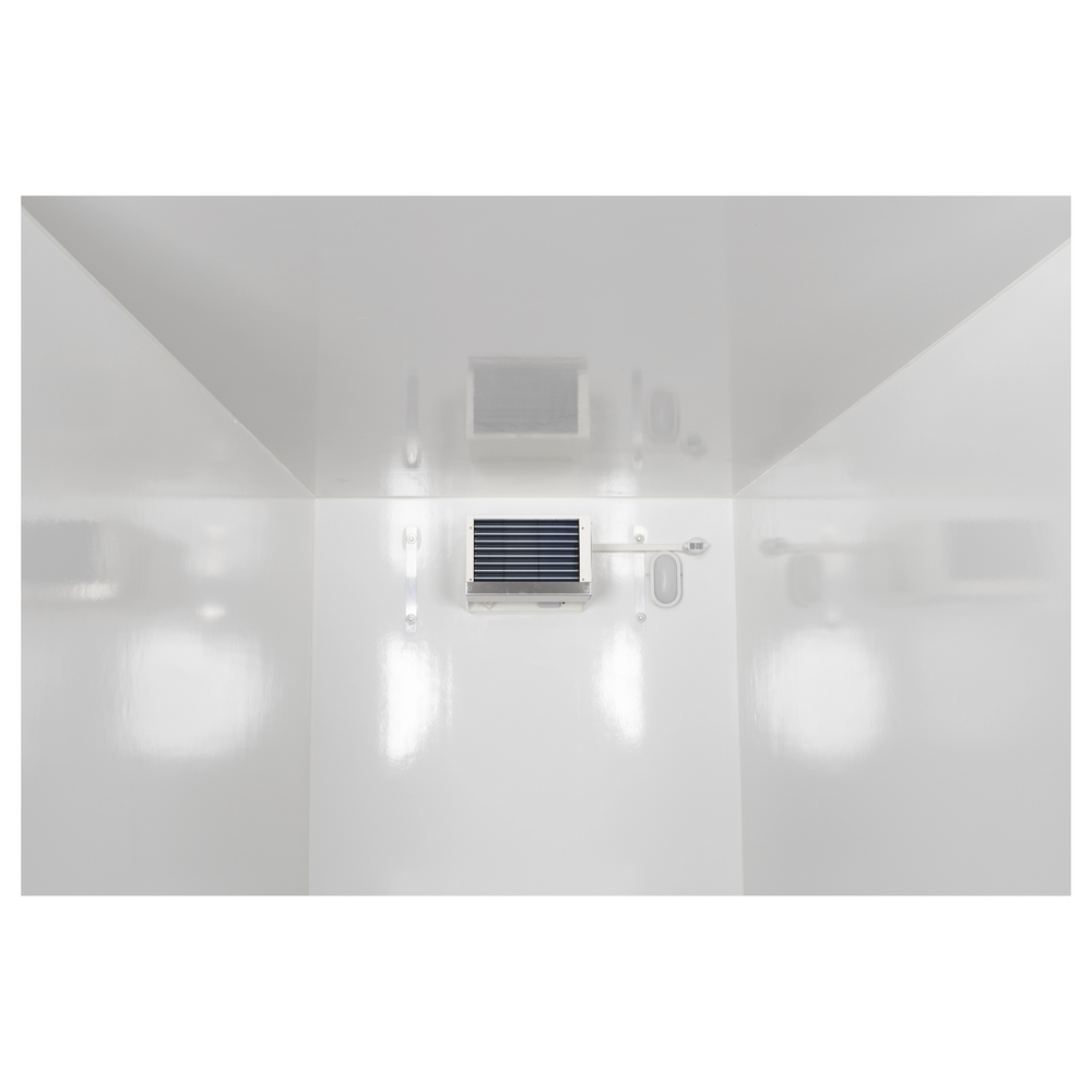 Den lukkede opbygning med sider og tag i isolerende skumpaneler giver termisk stabilitet, mens den robuste finerbund sikrer slidstyrke og lang levetid. De to aksler og hjulenes placering på siden af chassiset bidrager til stabil kørsel, selv under tung last og på ujævnt underlag.