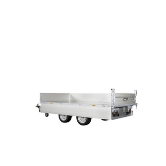 Modellen er produceret med varmgalvaniseret stålbund og aluminiumssider, som sikrer lang levetid og modstand mod rust. Alle fire sider kan åbnes, og de aftagelige hjørnestolper giver ekstra fleksibilitet, hvilket gør traileren ideel til lastning via truck eller kran, når materialer skal håndteres effektivt.