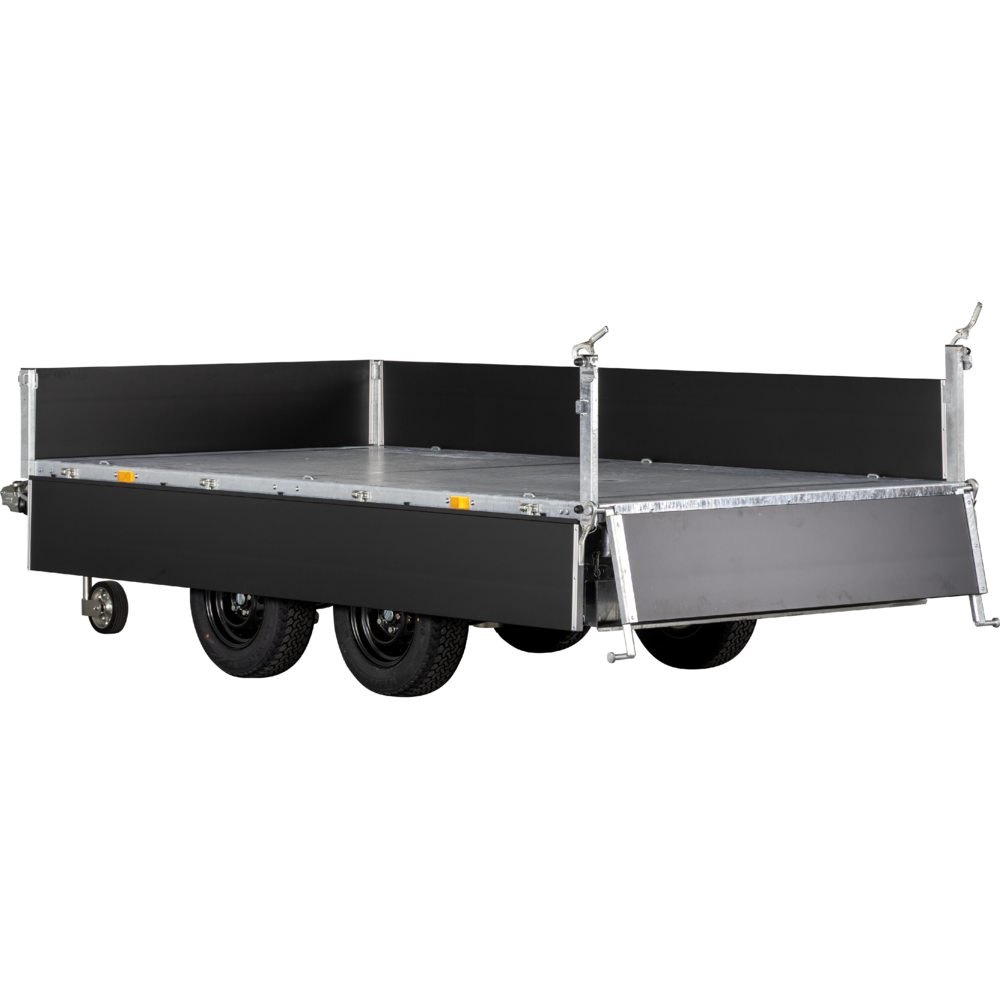 Traileren har to aksler og hjul under chassiset for maksimal lasteflade og stabil kørsel. Aluminiumssider, som kan åbnes på alle fire sider, og aftagelige hjørnestolper giver mulighed for tilpasning af ladet til forskellige typer gods, fra byggematerialer til maskiner.