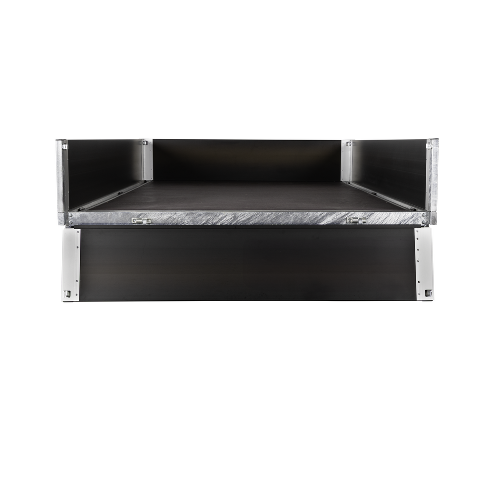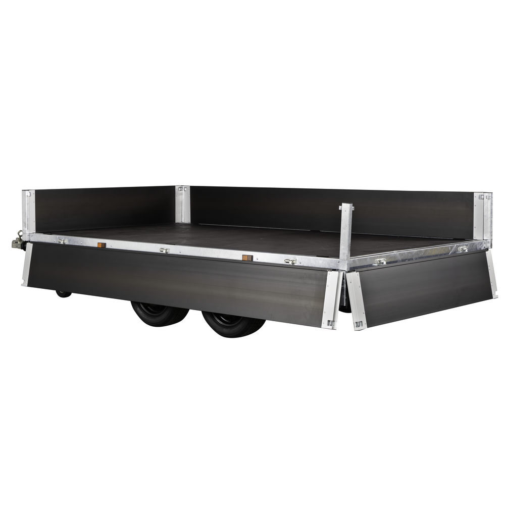 Med to aksler og hjul placeret under ladet opnås maksimal lasteflade og stabilitet under transport. Solide aluminiumssider og bund i slidstærk finer sikrer holdbarhed og lang levetid. Integreret lukkesystem og aftagelige hjørnestolper gør det nemt at tilpasse traileren til forskellige opgaver.