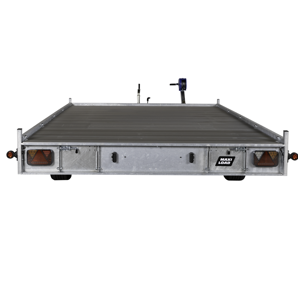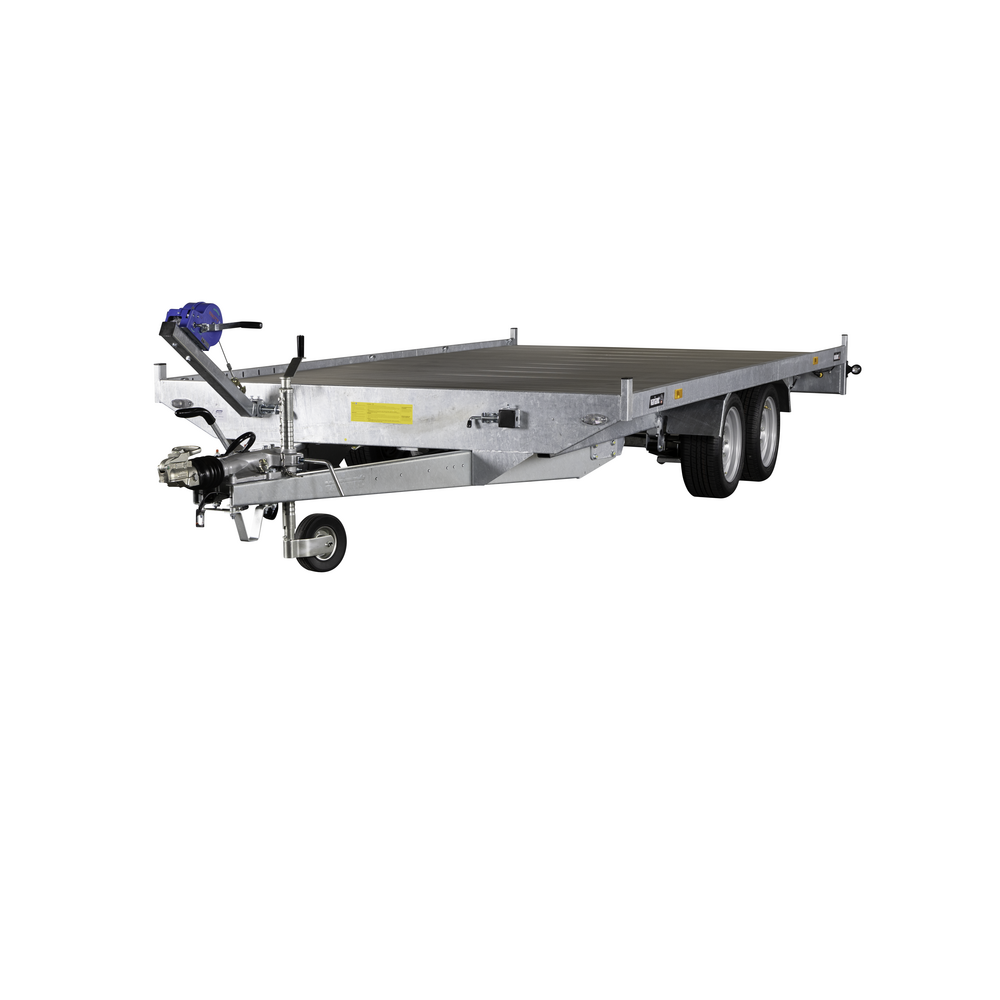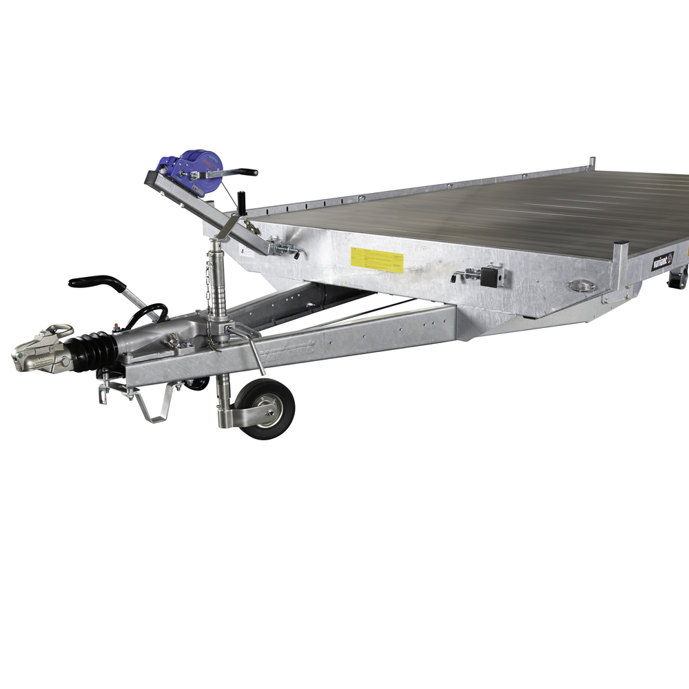 Traileren har LED-lys og næsehjul, som sikrer både synlighed og nem manøvrering under forskellige forhold. De 10 indvendige surringsøjer giver sikre fastgørelsesmuligheder til lasten, og det manuelle ophalerspil gør det muligt at trække køretøjer op på ladet. Rampeskuffer under ladet sikrer praktisk og sikker opbevaring af ramper.