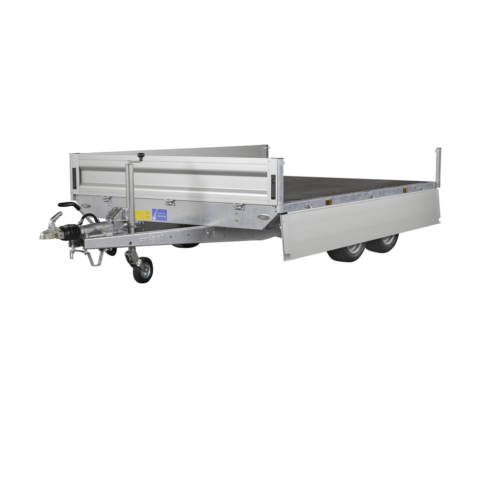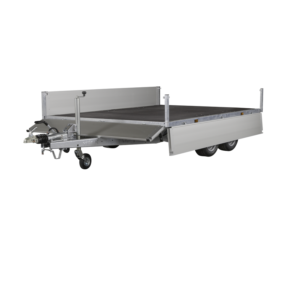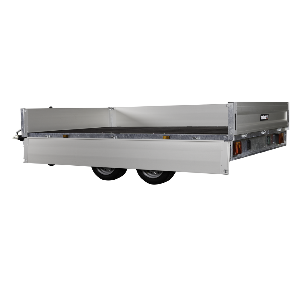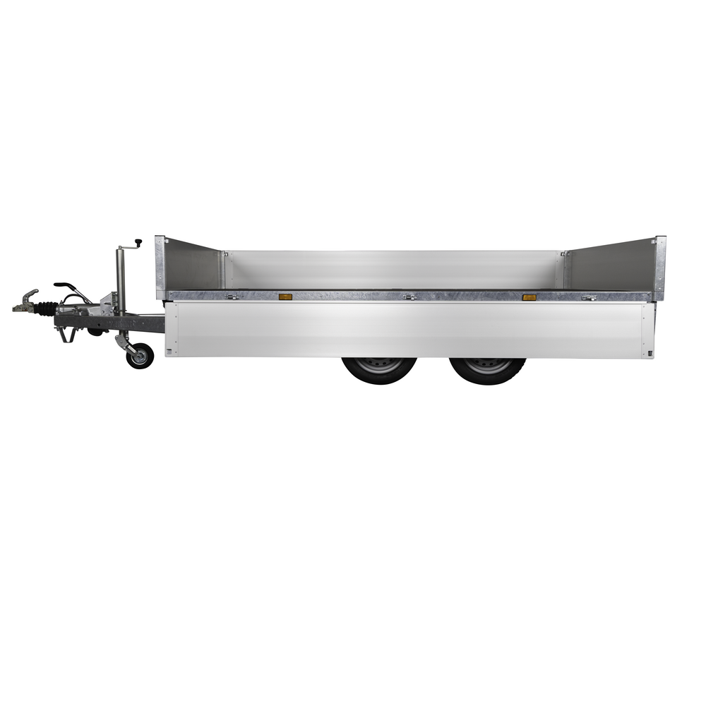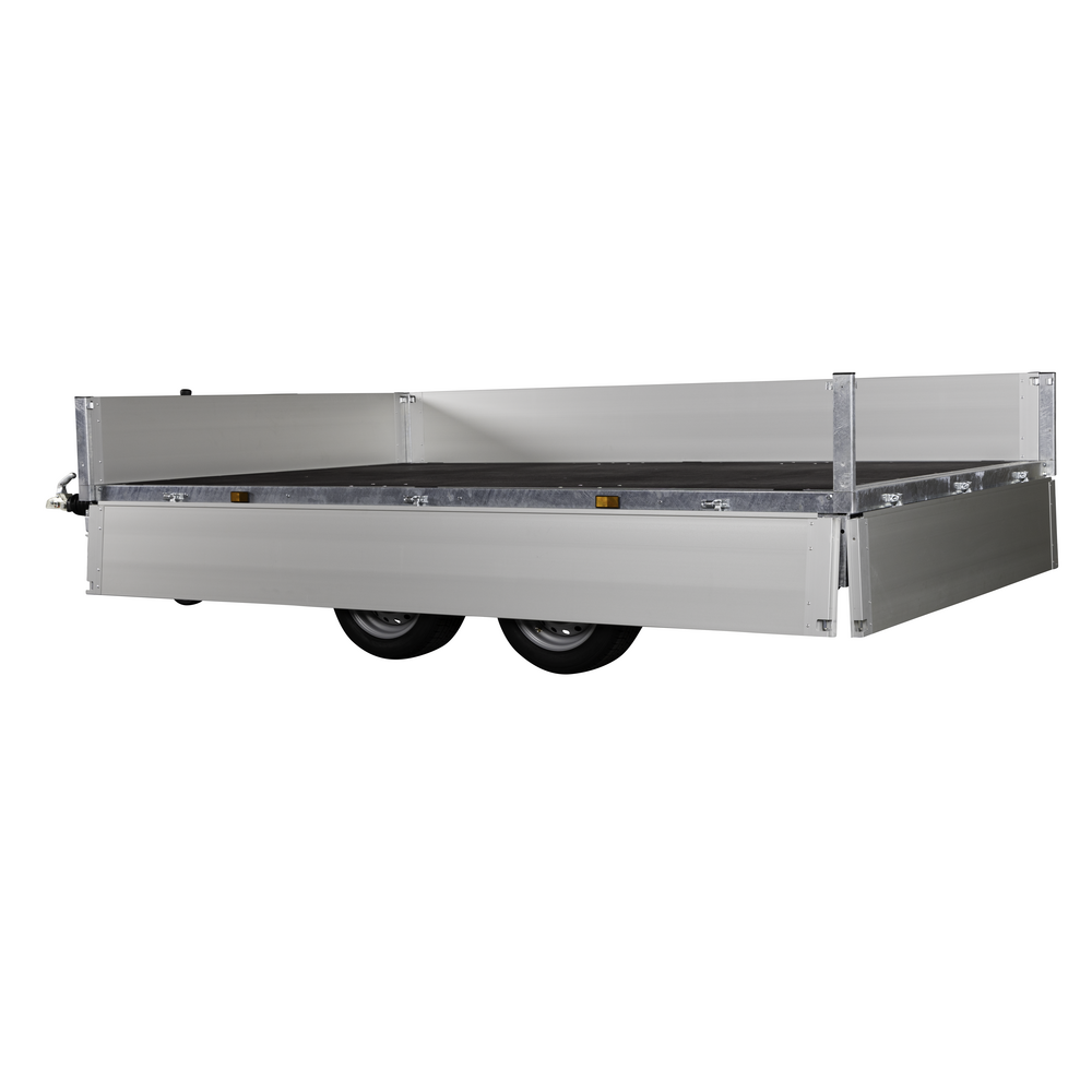 Traileren er udstyret med dobbeltaksler og hjul placeret under chassiset, hvilket giver optimal udnyttelse af ladets fulde bredde. Aluminiumsider og en bund i slidstærk finer sikrer holdbarhed og modstandskraft mod både vejr og hårdt arbejde. Alle fire sider kan åbnes, hvilket giver maksimal fleksibilitet ved transport af store eller uhåndterlige materialer.