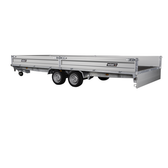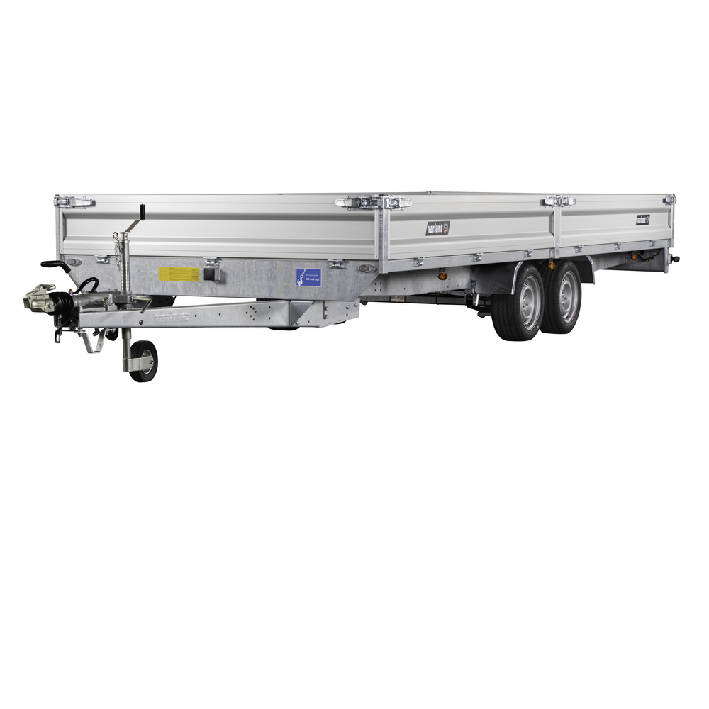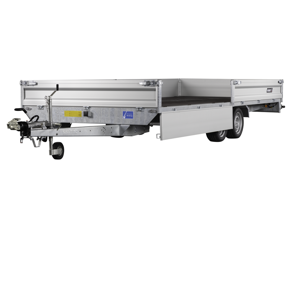 Alle fire sider kan åbnes, hvilket giver nem og effektiv læsning og aflæsning fra alle vinkler. De aftagelige hjørnestolper gør det muligt at tilpasse traileren til forskellige typer gods og opgaver – fra byggematerialer til længere emner.