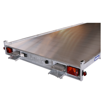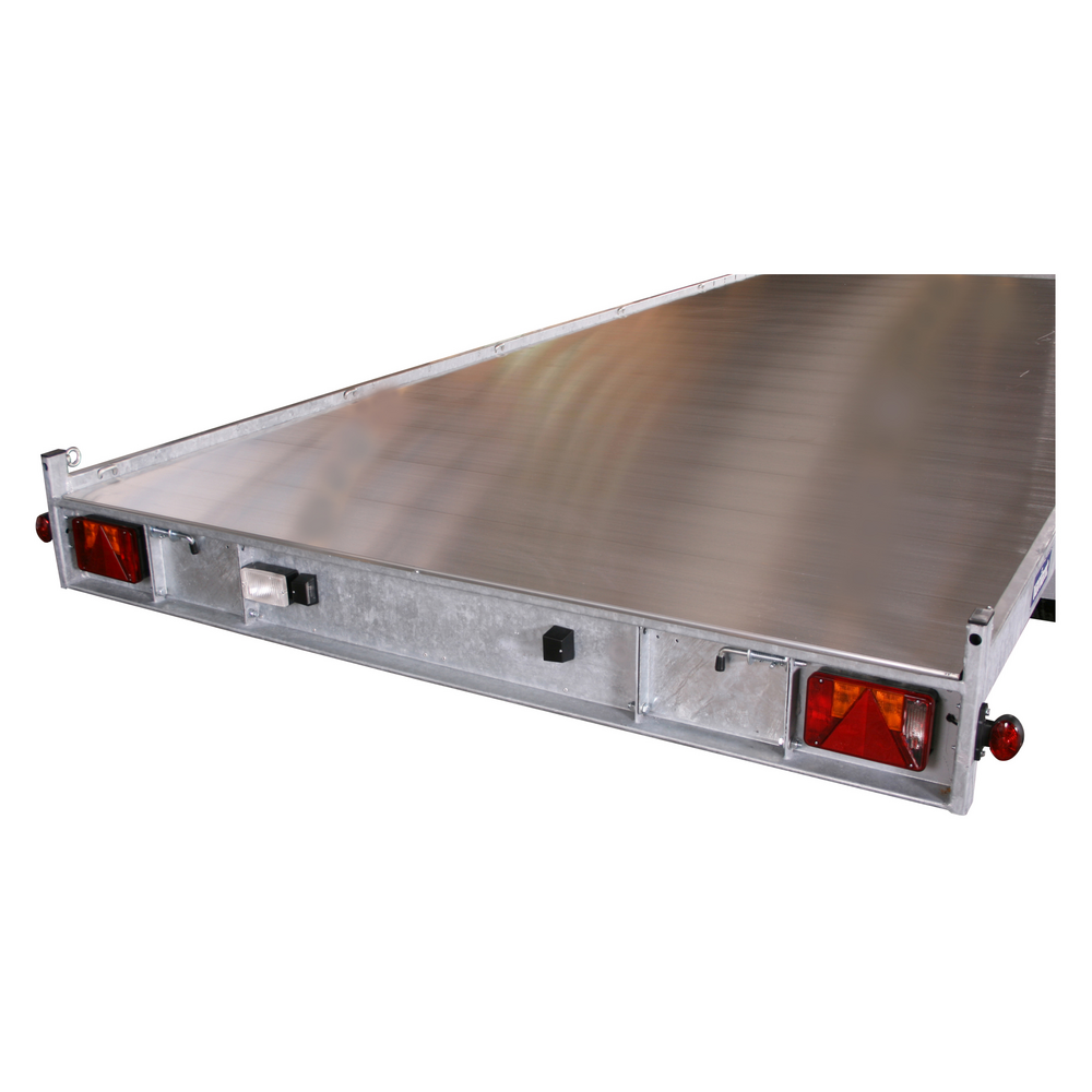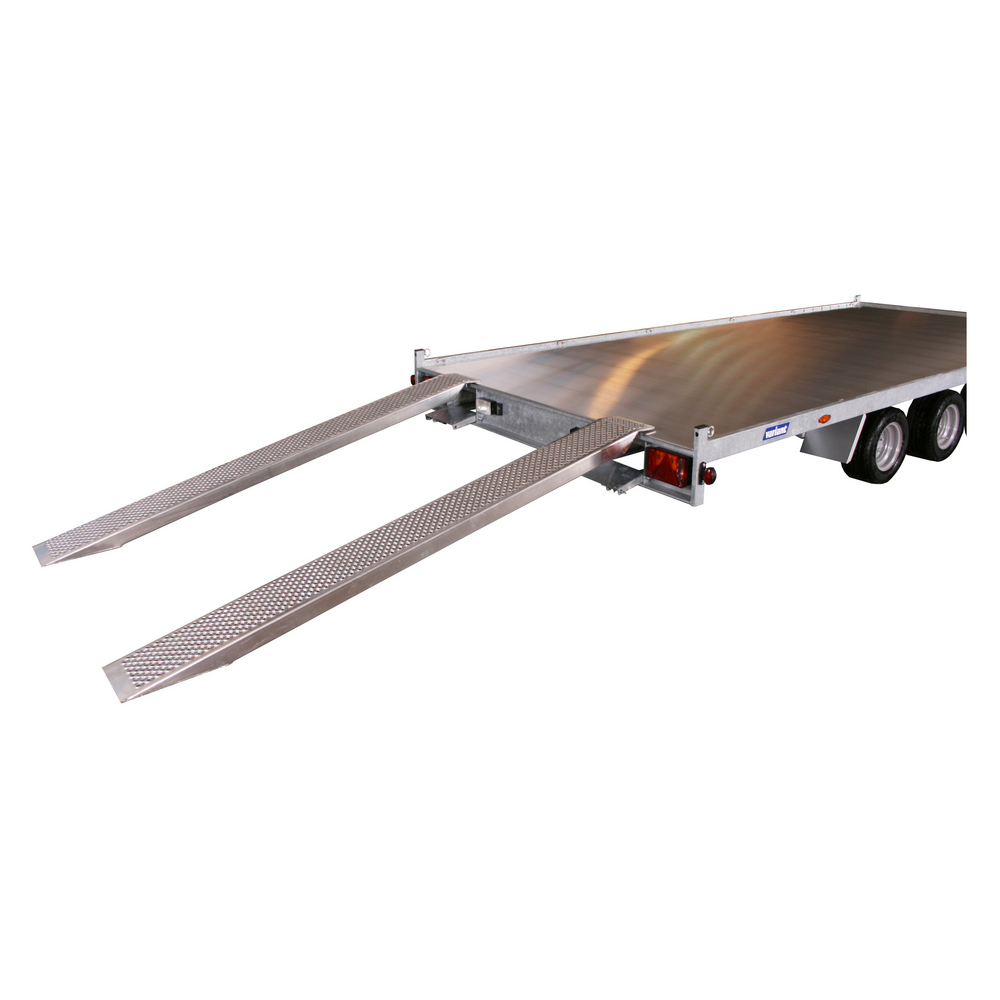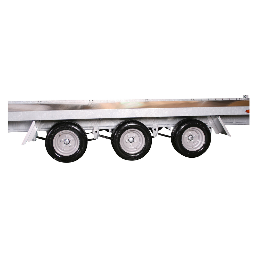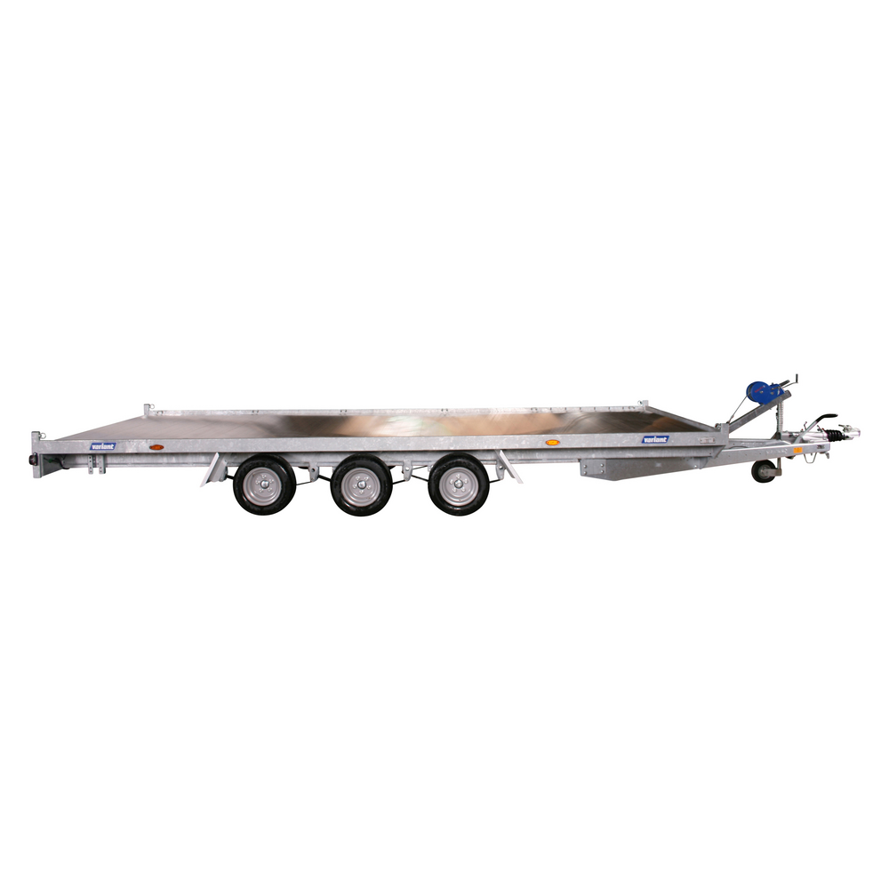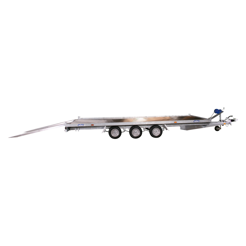 Traileren er udstyret med tre aksler og bremser, som sikrer stabilitet og sikker kørsel – selv ved tung last. Den slidstærke bund i aluminium giver høj modstandsdygtighed over for både vejr og daglig slitage, og det manuelle ophalerspil gør det nemt at trække maskiner og køretøjer sikkert op på ladet.