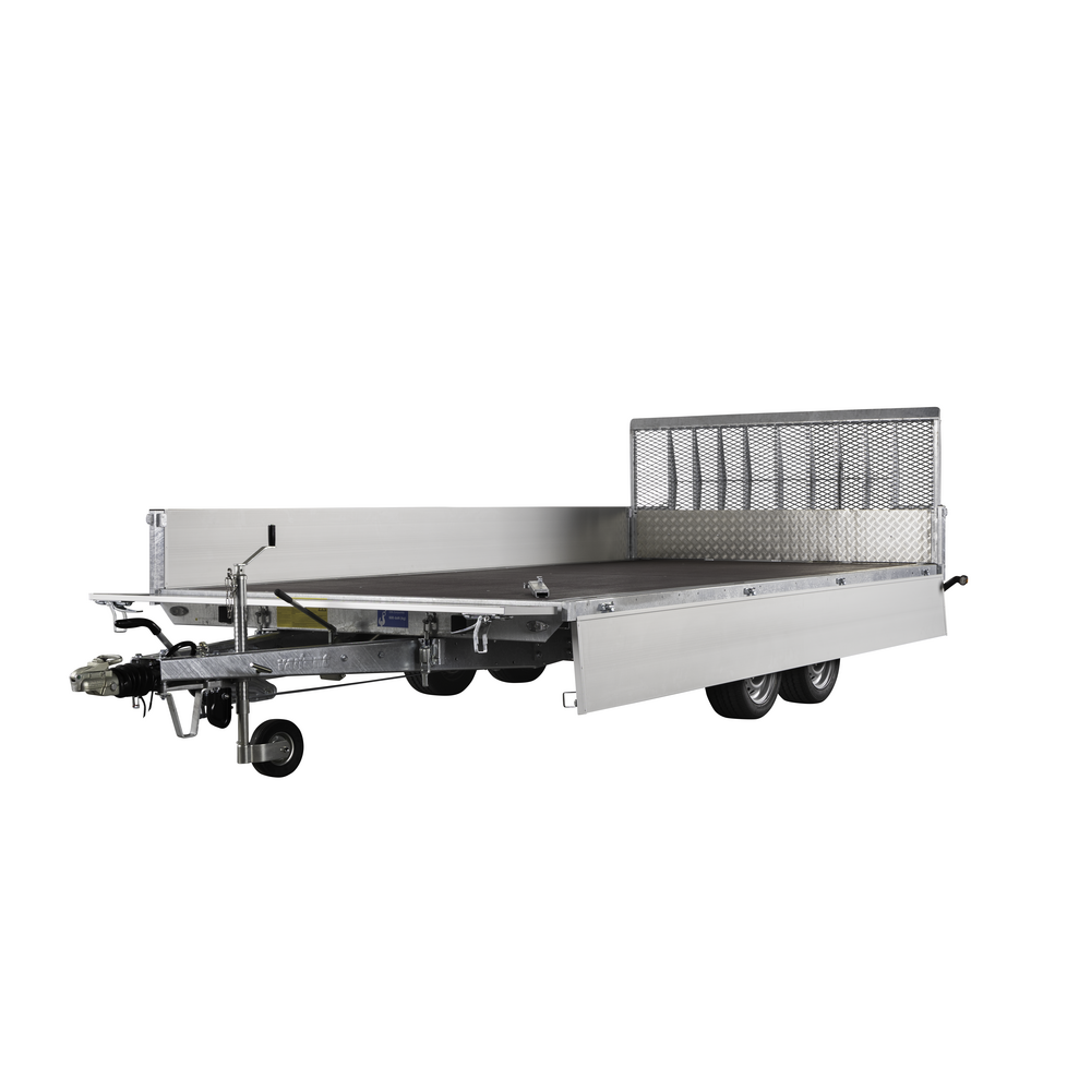 Hjulene er placeret under chassiset, hvilket maksimerer ladfladen, og den dobbelte aksel giver ekstra stabilitet under transport. Alle fire sider kan åbnes, hvilket gør læsning og aflæsning fleksibel fra forskellige vinkler, og de aftagelige hjørnestolper giver ekstra tilpasningsmuligheder.